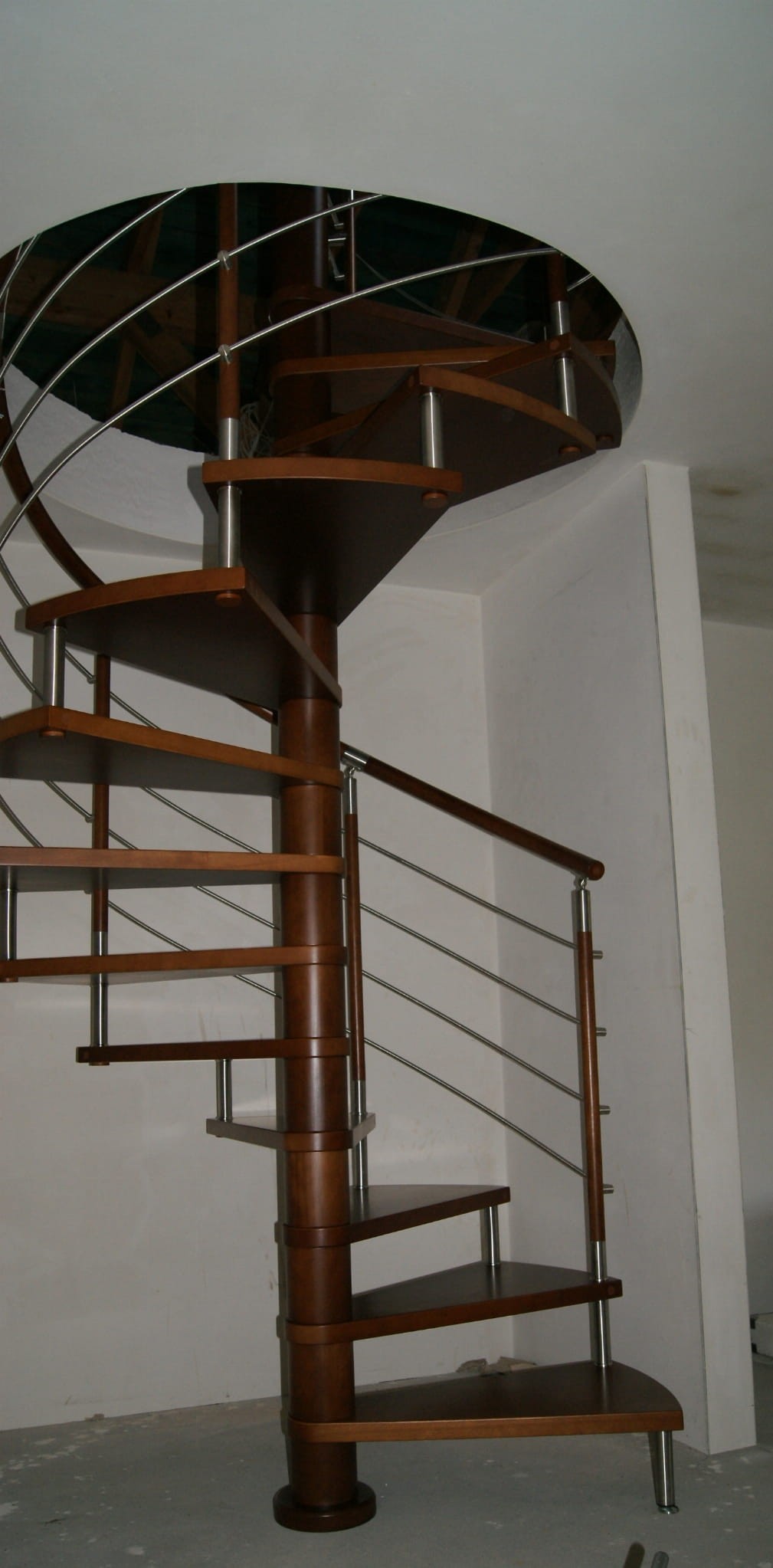 Eine Reihe von Wendeltreppen, die an den Durchmesser der Deckenöffnung von 190 cm angepasst sind. Die Elemente bestehen aus Massivholz (Farbe nach Wahl aus der Farbpalette des Herstellers) und pulverbeschichtetem Stahl in mattschwarzer Struktur. Sie können sie selbst montieren, der Hersteller bietet aber auch einen Montageservice gegen Aufpreis an.
