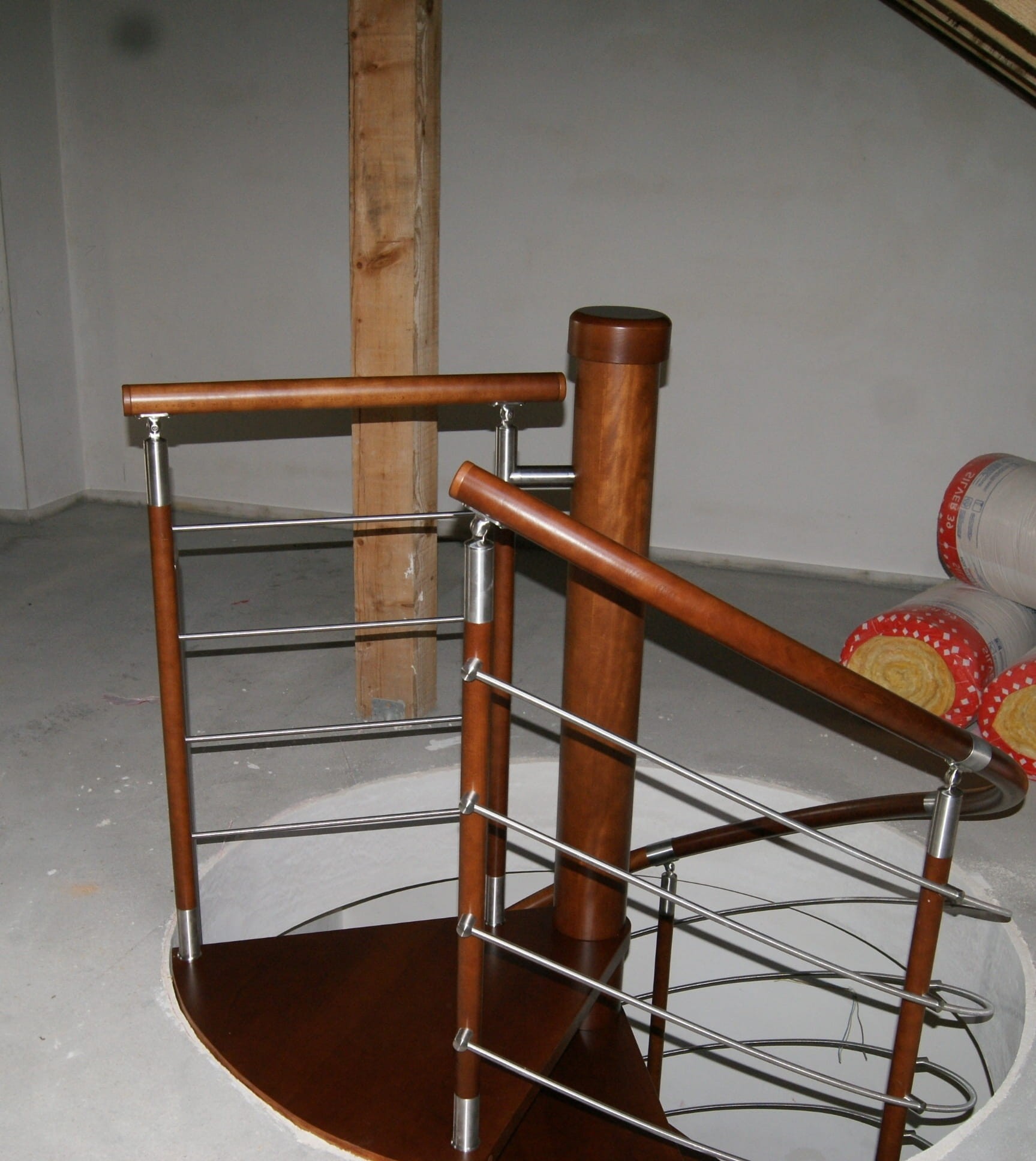 Die angebotenen Wendeltreppen passen in zwei Arten von Öffnungen in der Decke und haben abhängig davon unterschiedliche Podeste. Dreieckige Podeste passen in runde Öffnungen. Dreieckige und trapezförmige Plattformen sind auf quadratische Öffnungen abgestimmt. Die Treppe in diesem Modell hat eine rechte und linke Behandlung. Je nach Konzept sind sie universell montierbar.
