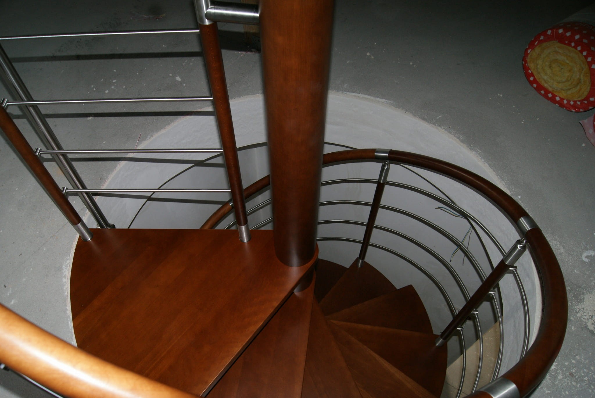 Eine Reihe von Wendeltreppen, die an den Durchmesser der Deckenöffnung von 200 cm angepasst sind. Die Elemente bestehen aus Massivholz (Farbe nach Wahl aus der Farbpalette des Herstellers) und pulverbeschichtetem Stahl in mattschwarzer Struktur. Sie können sie selbst montieren, der Hersteller bietet aber auch einen Montageservice gegen Aufpreis an.
