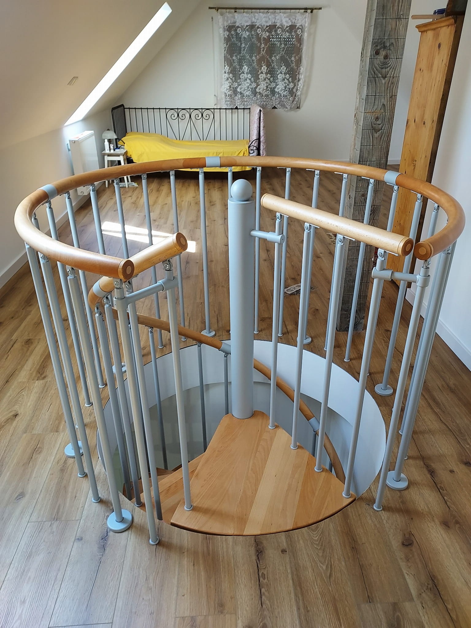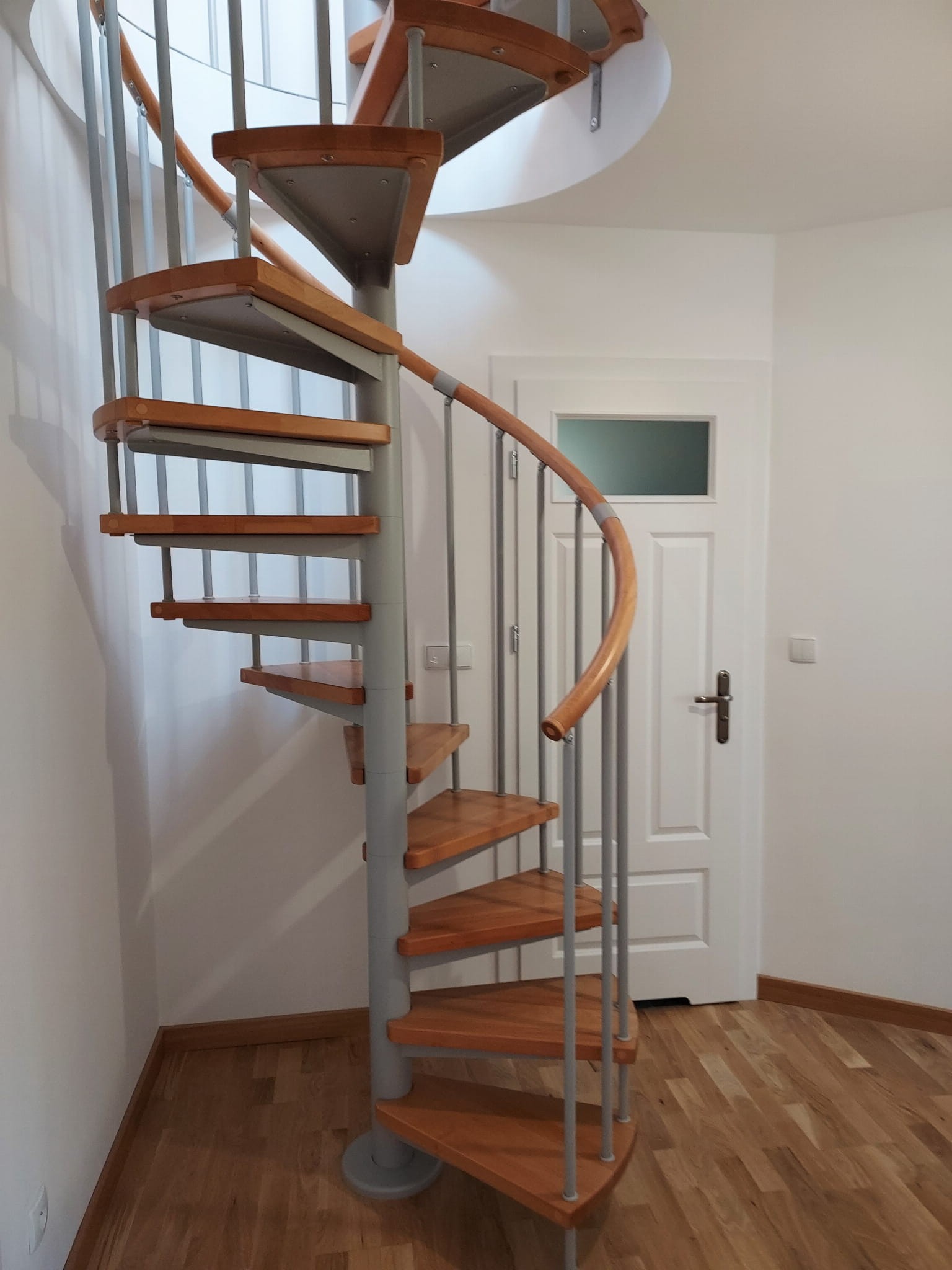 Eine Wendeltreppe, angepasst an den Durchmesser der Deckenöffnung von 210 cm. Die Elemente bestehen aus Massivholz (Farbe zur Auswahl aus der Farbpalette des Herstellers) und pulverbeschichtetem Stahl in Silbermatte Struktur. Sie können sie selbst zusammenbauen, der Hersteller bietet jedoch gegen Aufpreis auch einen Montageservice an.