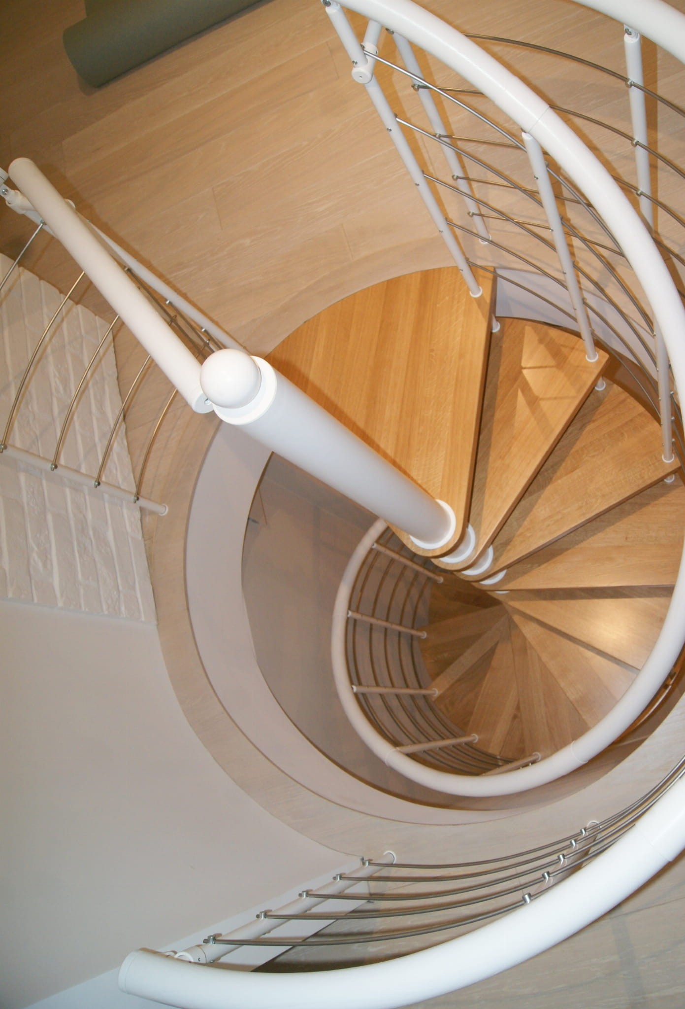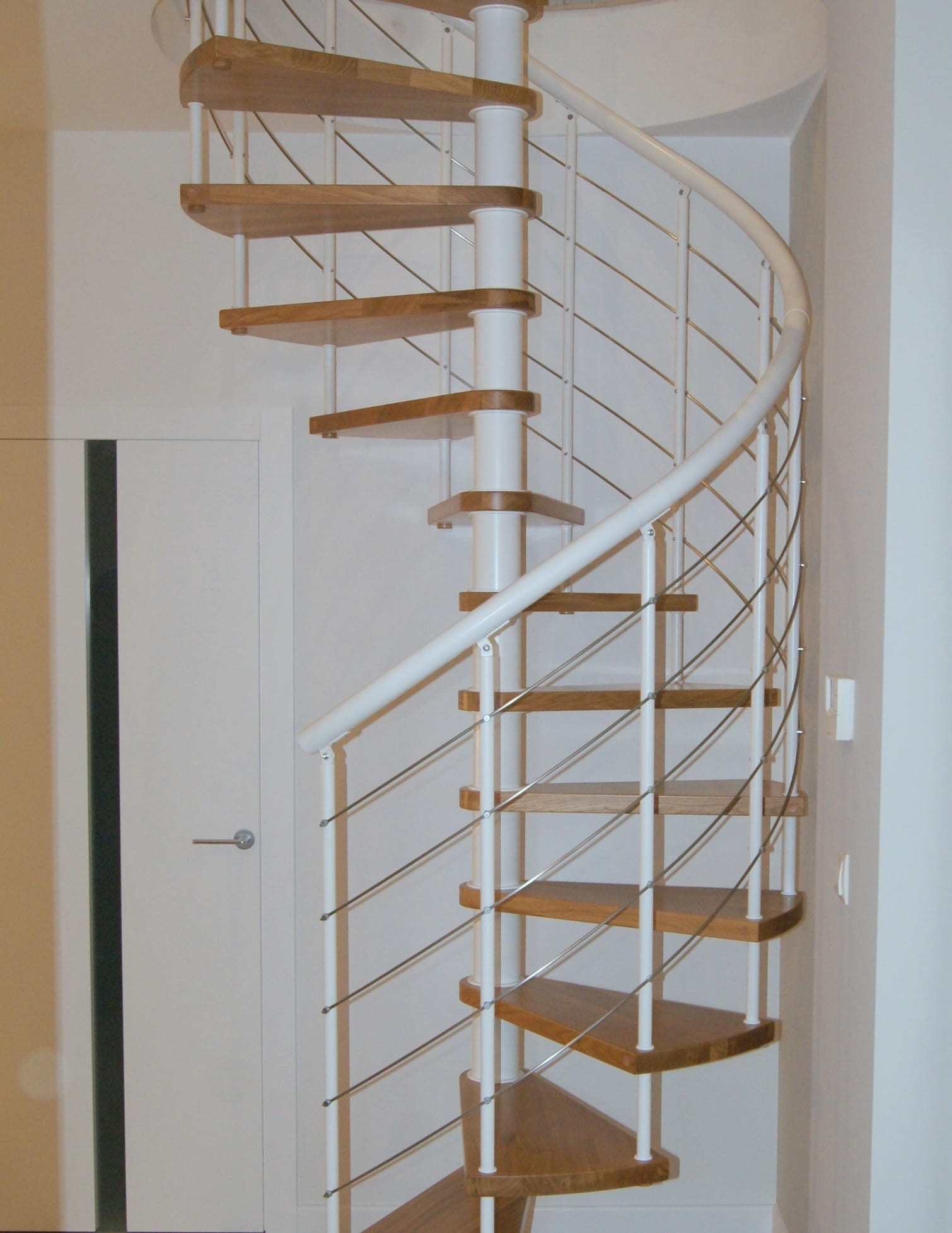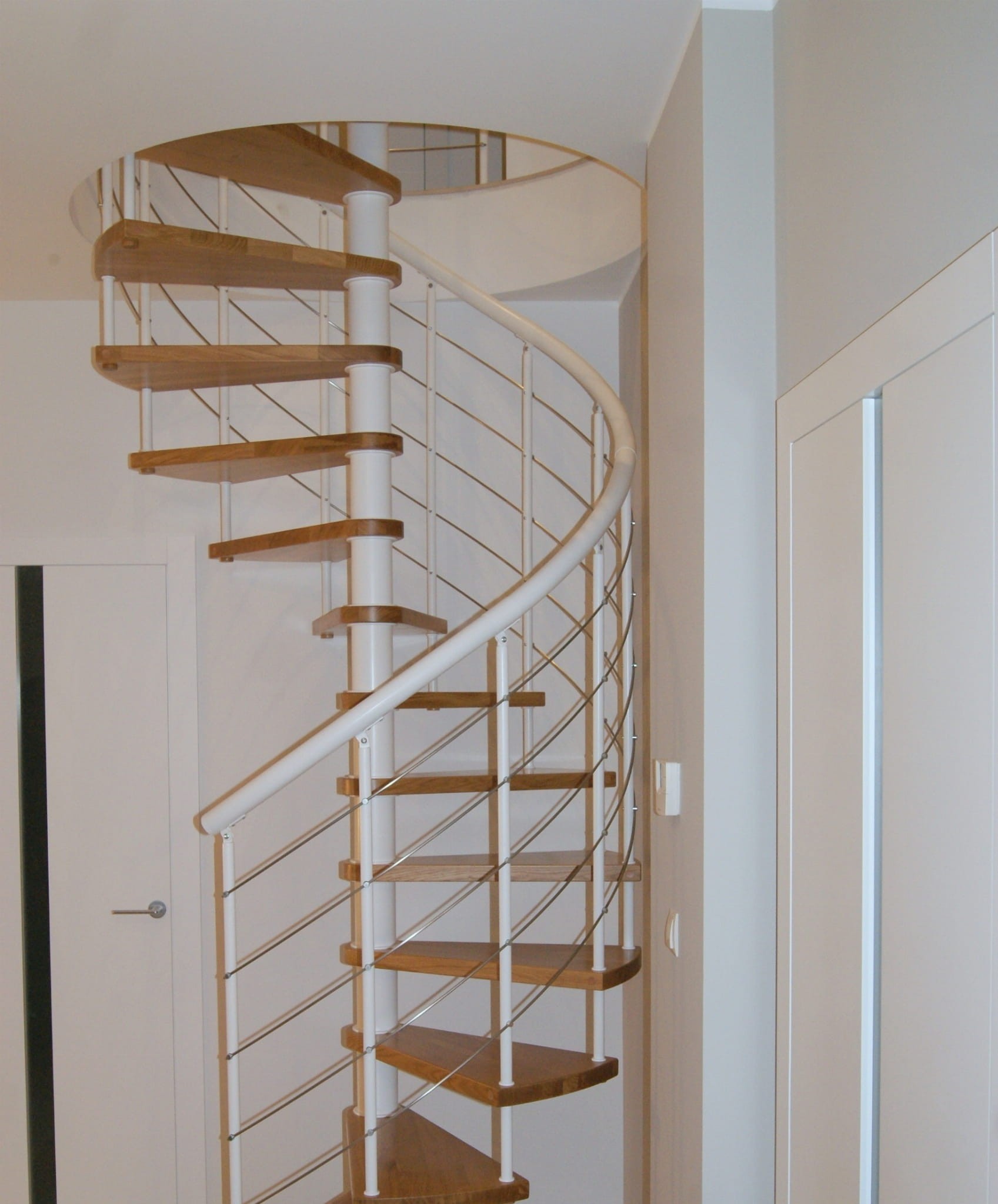 A set of spiral stairs adapted to the diameter of the opening in the ceiling of 210 cm. The elements are made of solid wood (color to choose from the manufacturer's color palette) and powder coated steel in white matt. You can assemble them yourself, but the manufacturer also provides an assembly service for an additional fee.