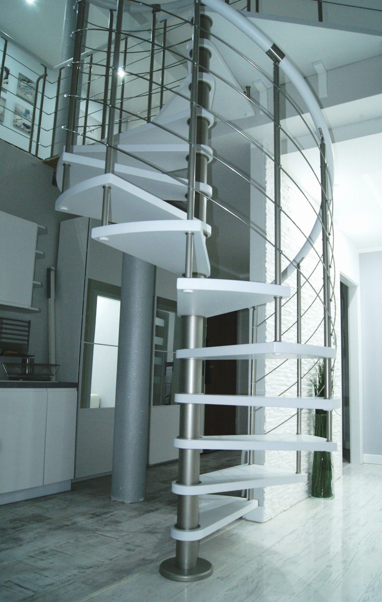 The offered spiral stairs fit into two types of openings in the ceiling and, depending on them, have different landings. Triangular landings fit in round openings. Triangular and trapezoidal platforms are matched to square openings. The stairs in this model have a right and left treatment. They can be mounted universally, depending on the concept.