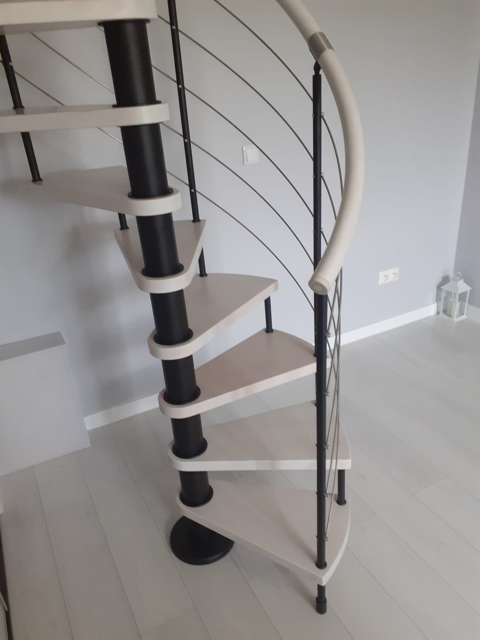 A set of spiral stairs adapted to the diameter of the opening in the ceiling of 170 cm. The elements are made of solid wood (color to choose from the manufacturer's color palette) and powder coated steel in silver matt structure. You can assemble them yourself, but the manufacturer also provides an assembly service for an additional fee.