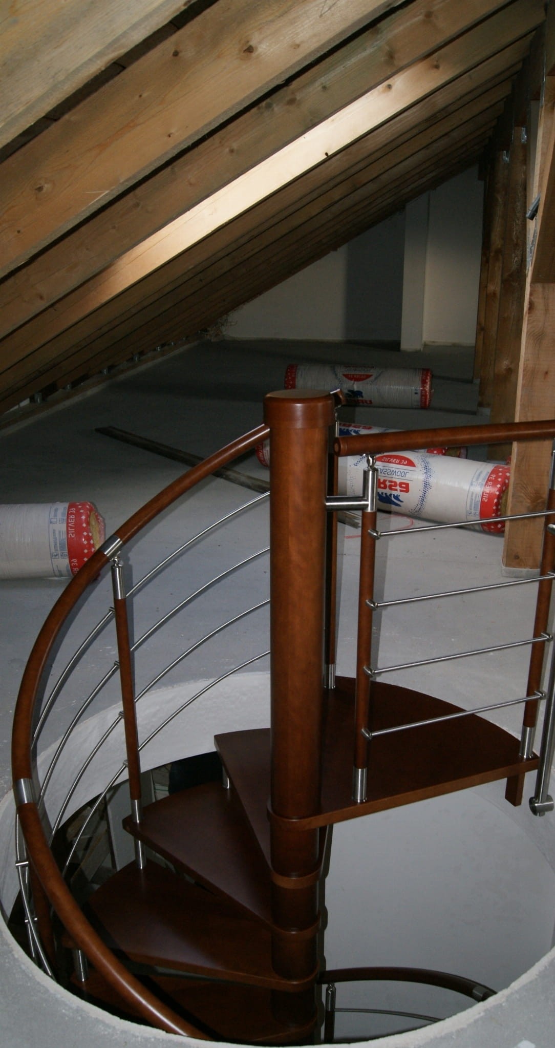 The offered spiral stairs fit into two types of openings in the ceiling and, depending on them, have different landings. Triangular landings fit in round openings. Triangular and trapezoidal platforms are matched to square openings. The stairs in this model have a right and left treatment. They can be mounted universally, depending on the concept.