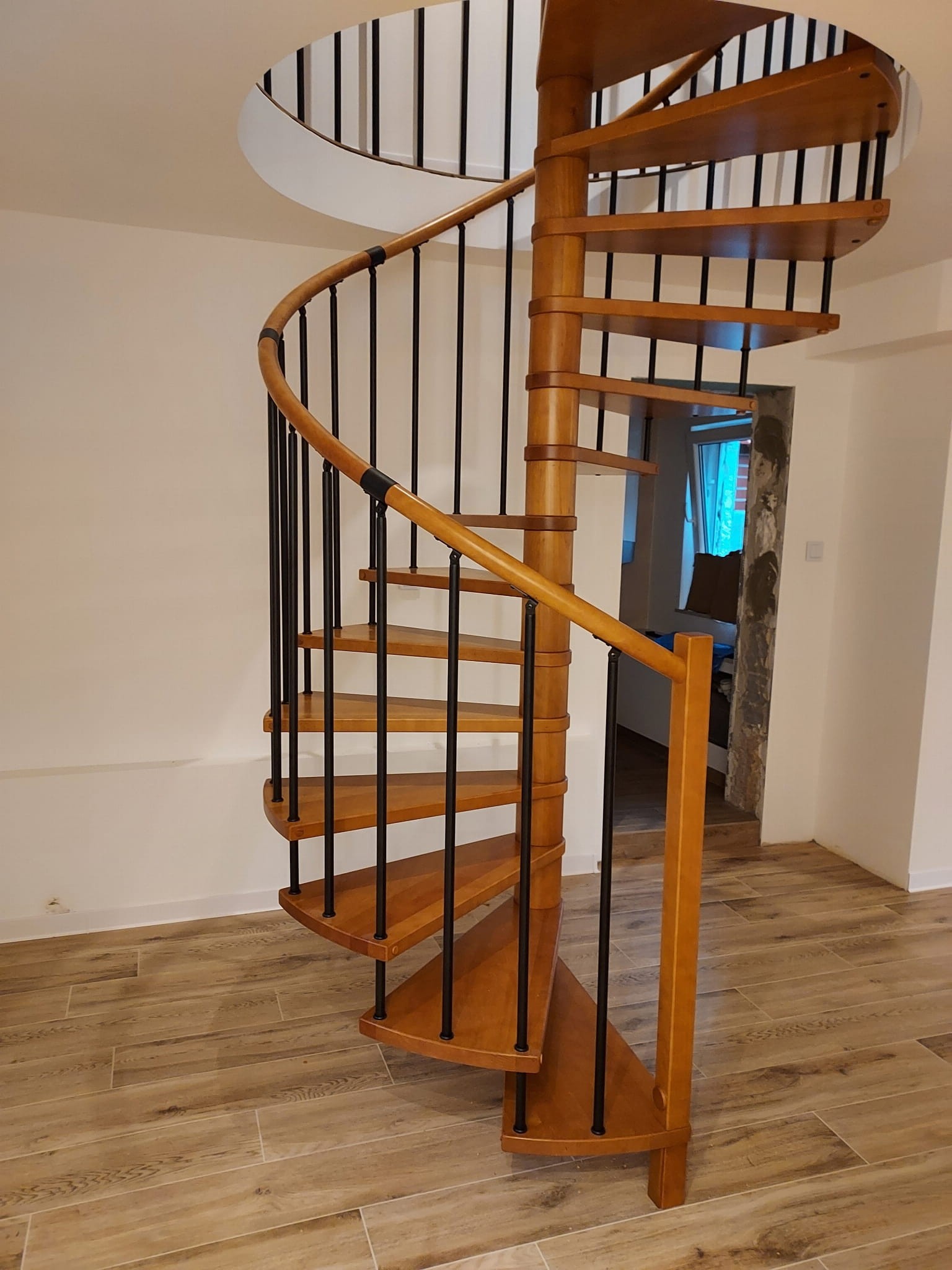 A set of spiral stairs adapted to the diameter of the opening in the ceiling of 140 cm. The elements are made of solid wood (color to choose from the manufacturer's color palette) and powder-coated steel in matt black structure. You can assemble them yourself, but the manufacturer also provides an assembly service for an additional fee.