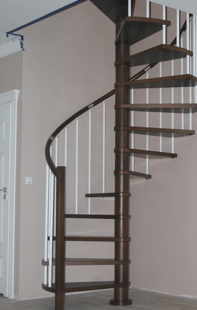 A set of spiral stairs adapted to the diameter of the opening in the ceiling of 120 cm. The elements are made of solid wood (color to choose from the manufacturer's color palette) and powder coated steel in white matt structure. You can assemble them yourself, but the manufacturer also provides an assembly service for an additional fee.