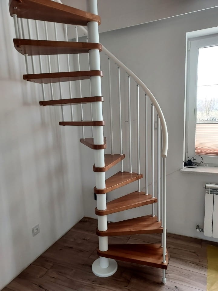 A set of spiral stairs adapted to the diameter of the opening in the ceiling of 150 cm. The elements are made of solid wood (color to choose from the manufacturer's color palette) and powder-coated steel in a matte white structure. You can assemble them yourself, but the manufacturer also provides an assembly service for an additional fee.