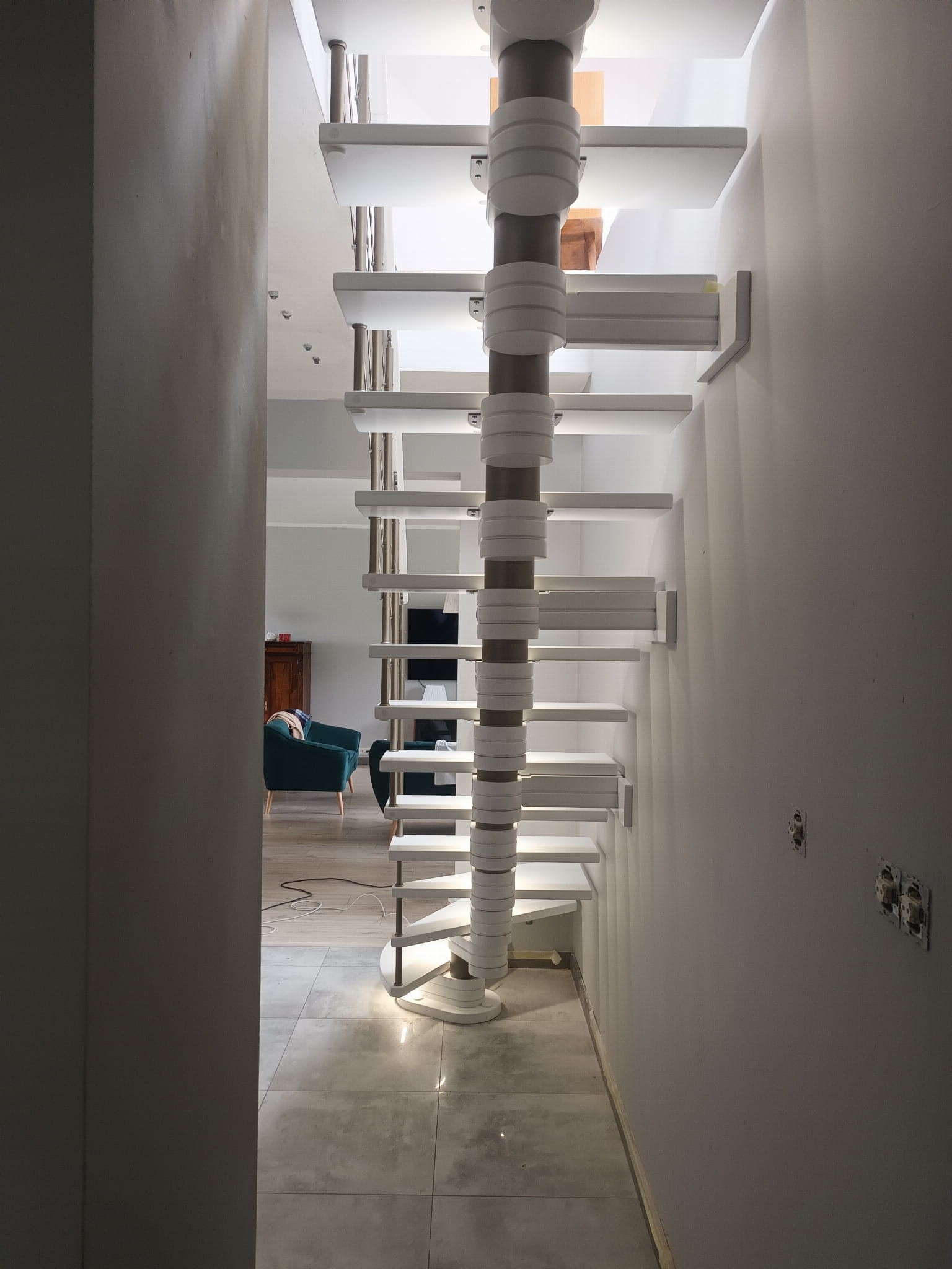 It is recommended to install the stairs next to the wall, up to 5 cm from it, which allows the installation of anchors. If the wall cannot withstand the anchoring, a supporting column should be used instead. For free-standing stairs, it is planned to use a supporting column, as well as a double-sided safety railing, additional options on request.