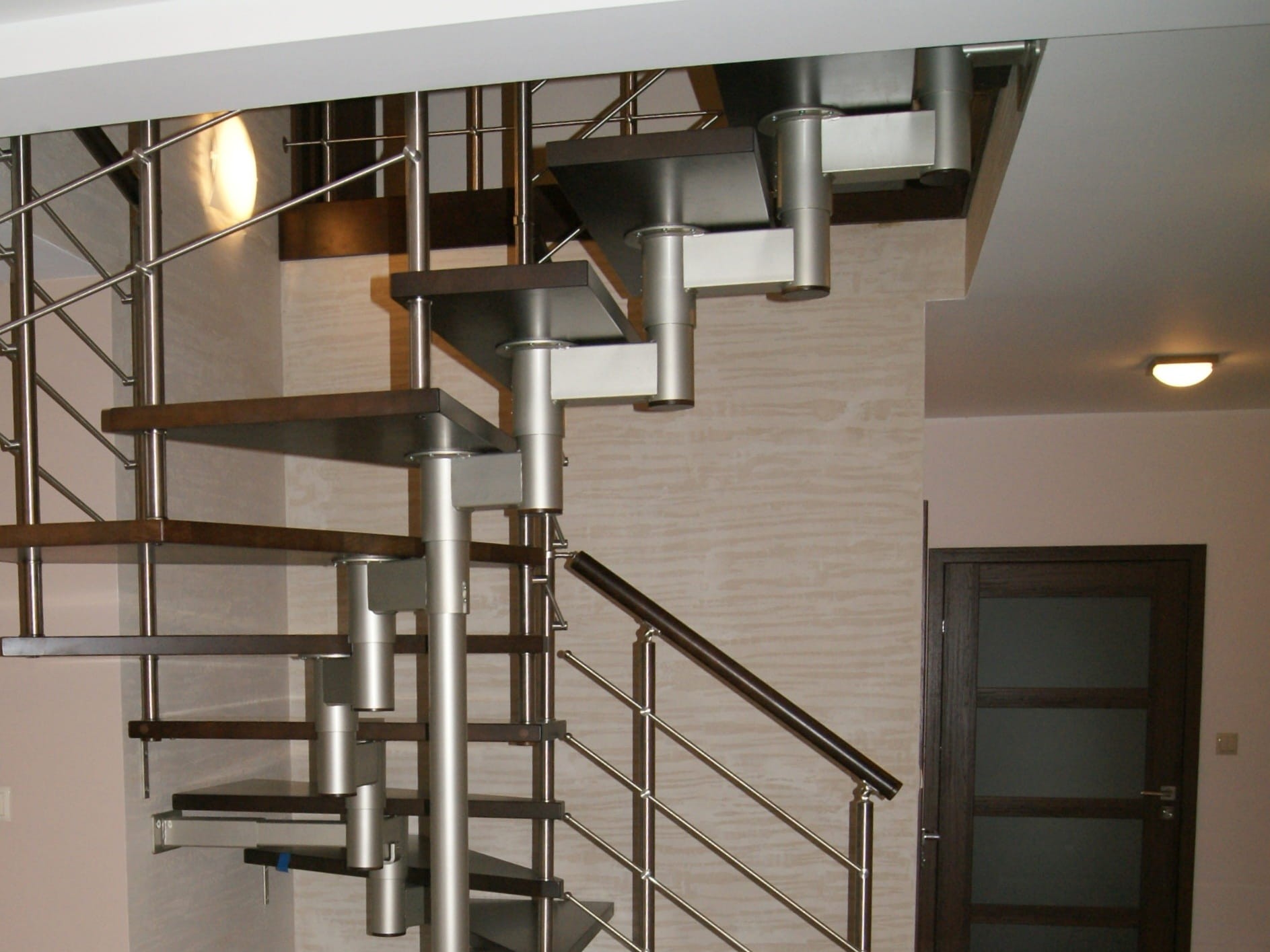 It is recommended to install the stairs next to the wall, up to 5 cm from it, which allows the installation of anchors. If the wall cannot withstand the anchoring, a supporting column should be used instead. For free-standing stairs, it is planned to use a supporting column, as well as a balustrade protecting both sides, additional options on request.