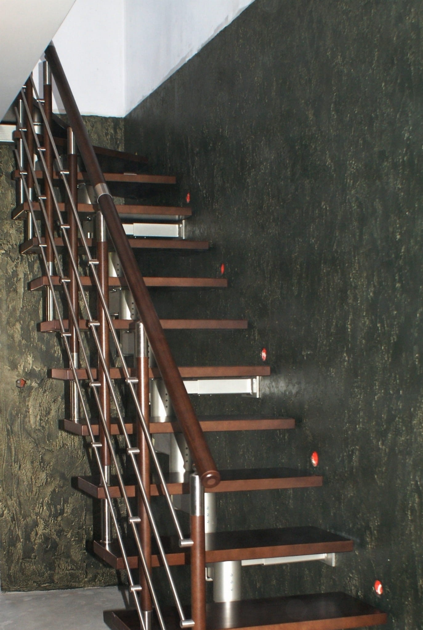 It is recommended to install the stairs next to the wall, up to 5 cm from it, which allows the installation of anchors. If the wall cannot withstand the anchoring, a supporting column should be used instead. For free-standing stairs, it is planned to use a supporting column, as well as a double-sided safety railing, additional options on request.