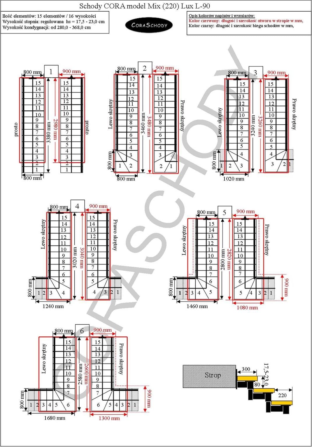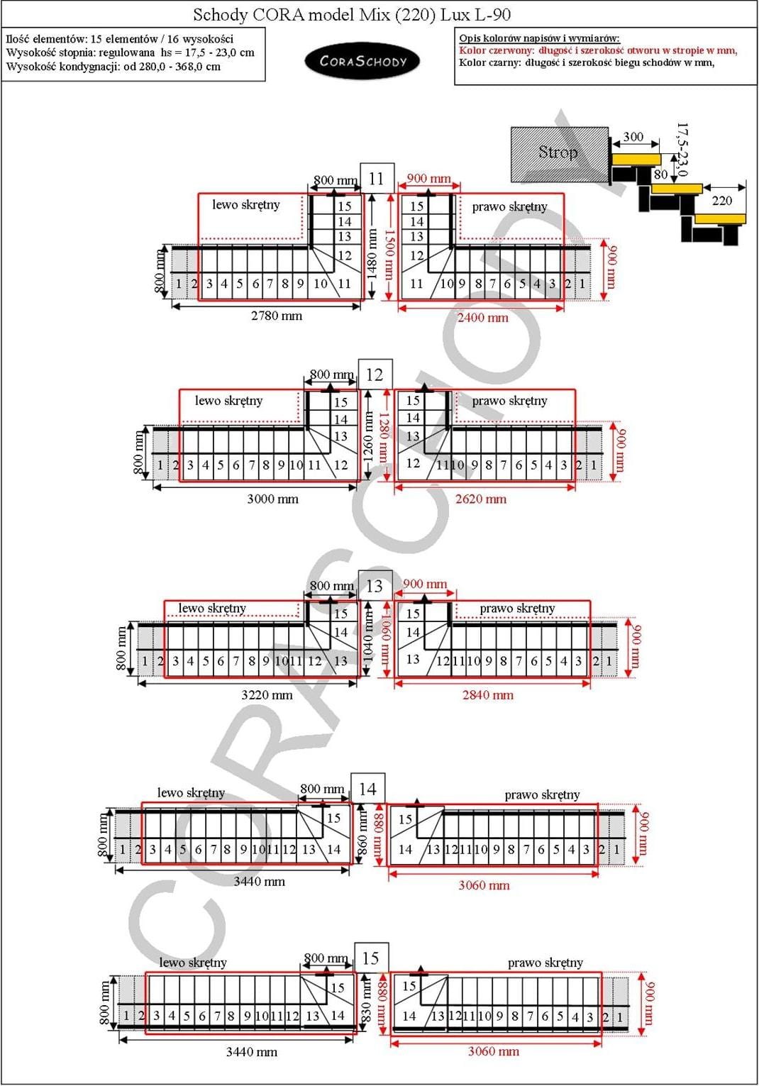 Floor to floor 228 - 299 cm - 12 steps / 13 heights (- 3 steps)