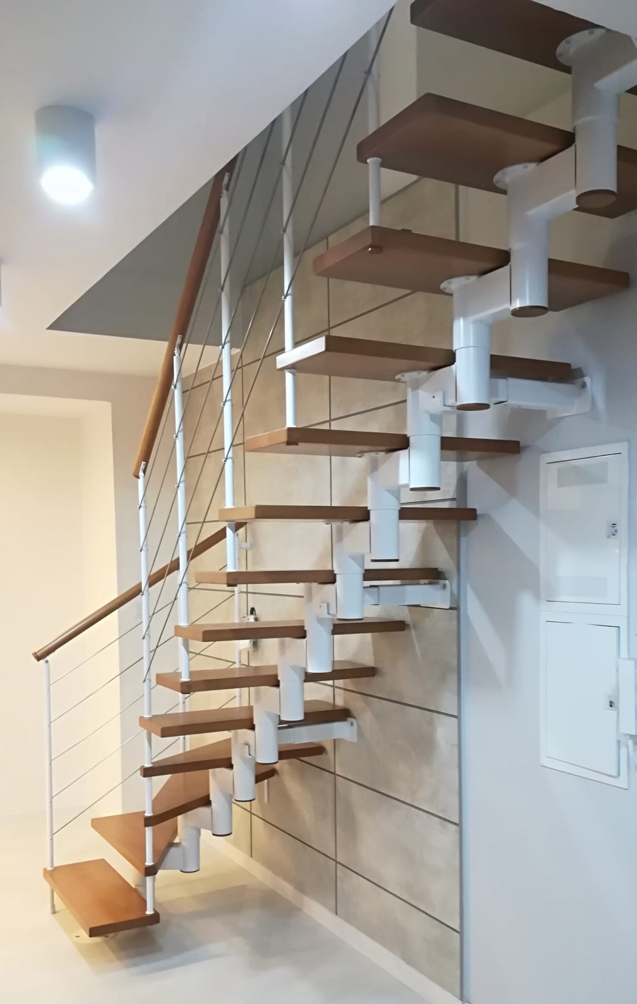 It is recommended to install the stairs next to the wall, up to 5 cm from it, which allows the installation of anchors. If the wall does not withstand the anchoring, a support column must be used alternatively. For free-standing stairs, it is planned to use a support pole, as well as railings securing on both sides, additional options on request.