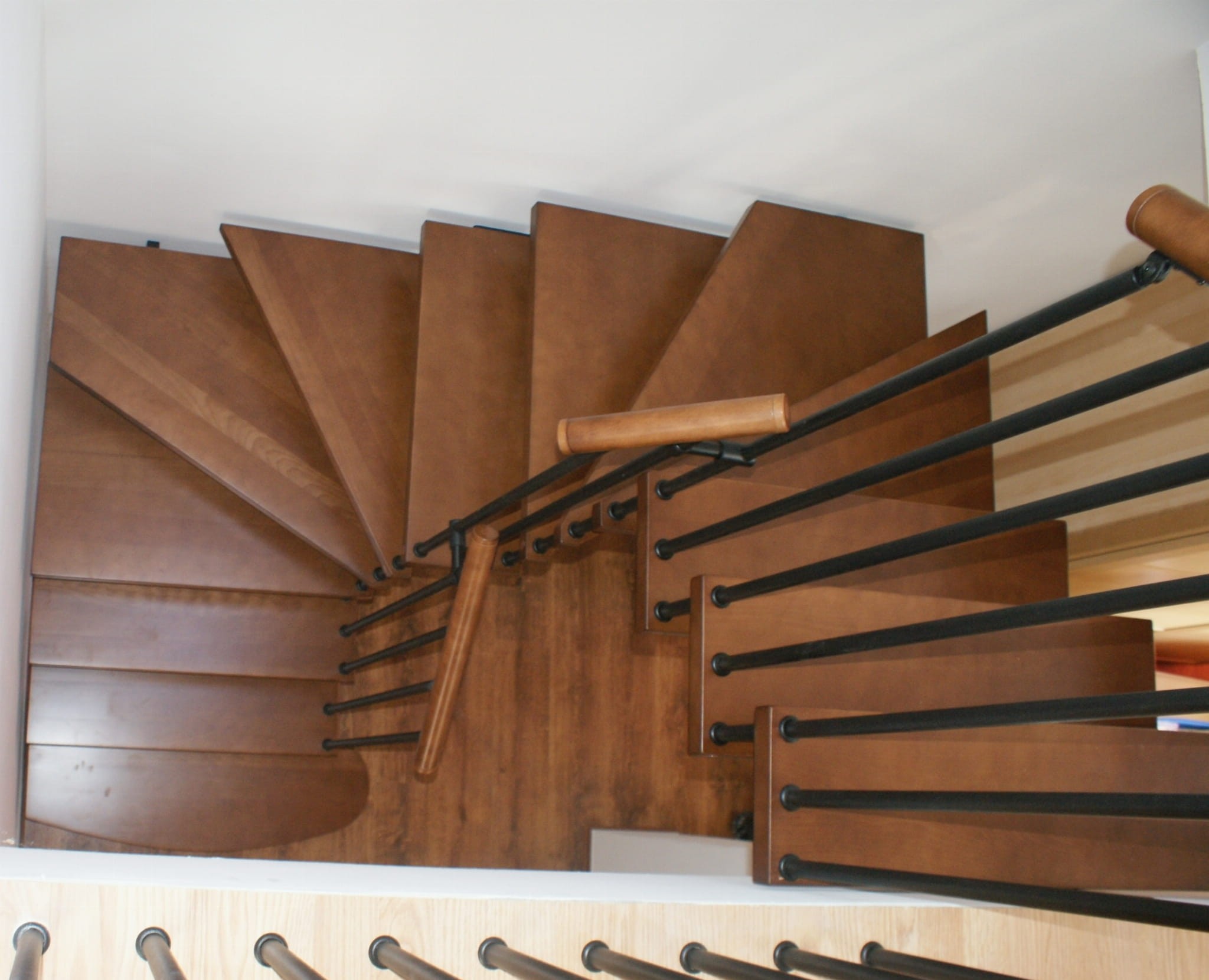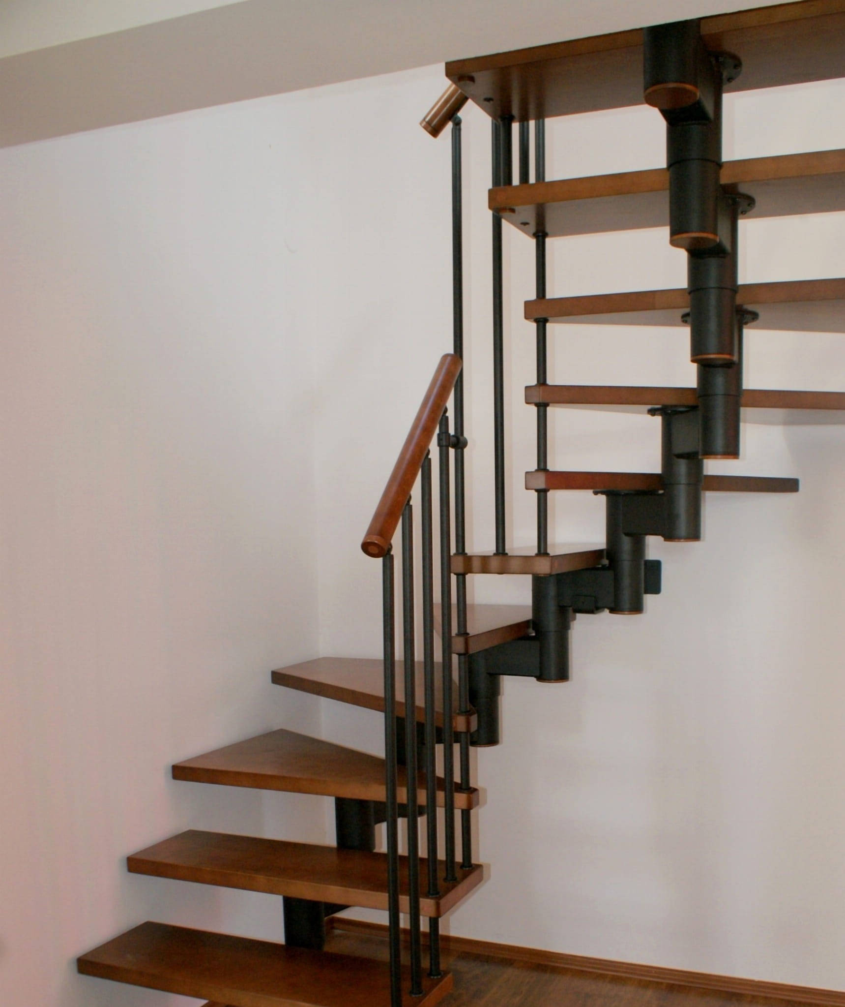 The stairs should partially run against the wall. They must not be more than 5 cm away from the wall. It is related to the safety of using the stairs. An anchor to the wall is essential.