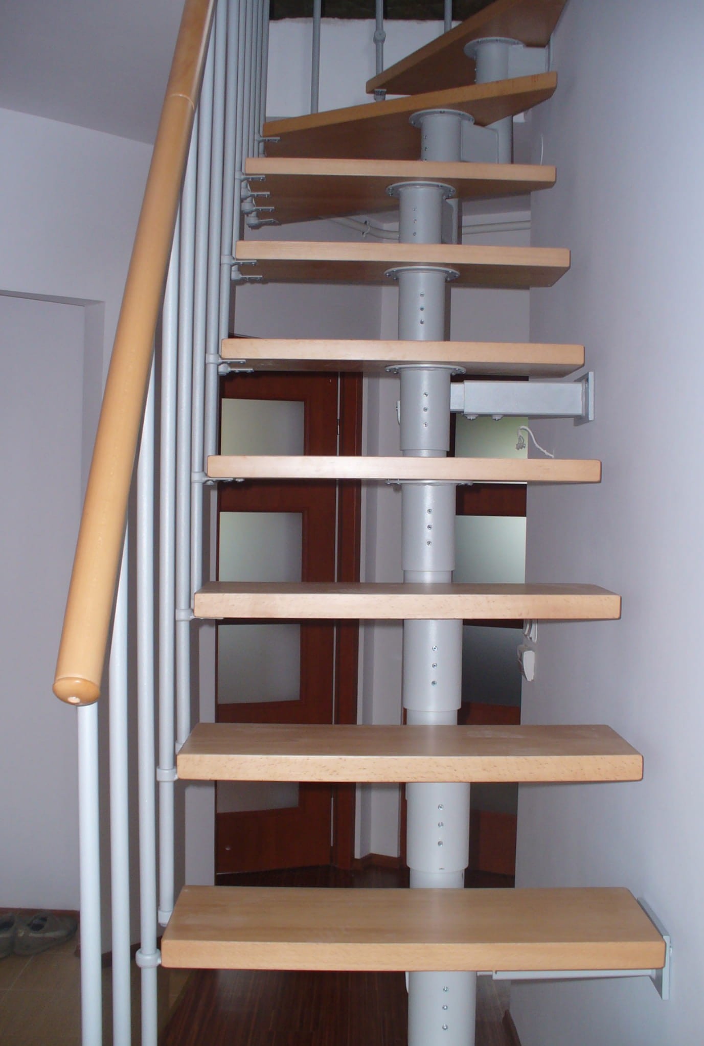 The stairs should partially run against the wall. They must not be more than 5 cm away from the wall. It is related to the safety of using the stairs. An anchor to the wall is essential. If the stairs are located as free-standing, it is advisable to use: - a supporting column, - a balustrade on both sides of the stairs,