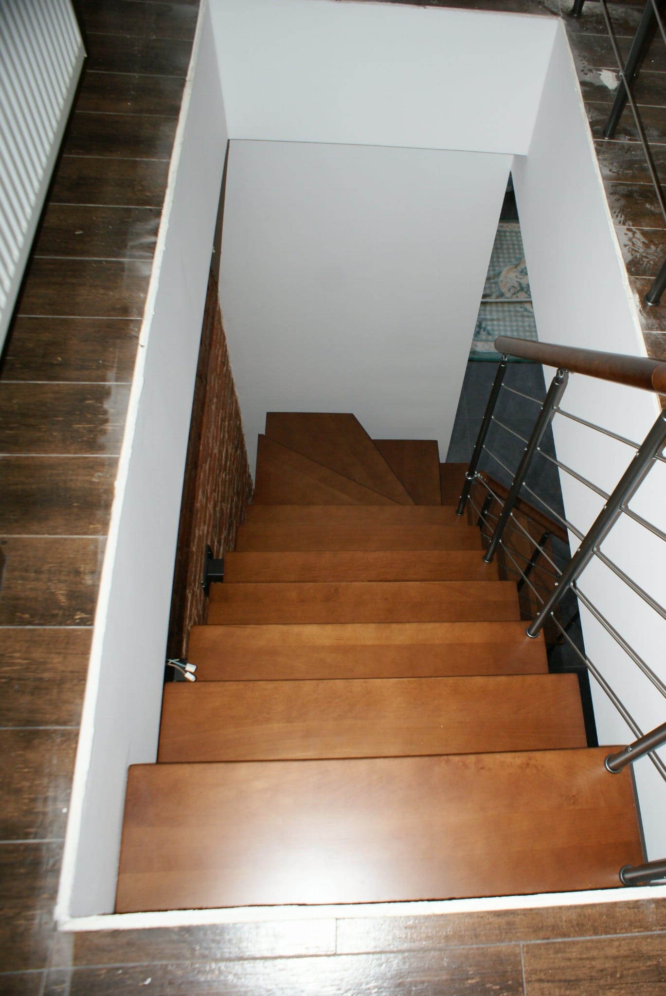 The stairs should partially run against the wall. They must not be more than 5 cm away from the wall. It is related to the safety of using the stairs. An anchor to the wall is essential.
