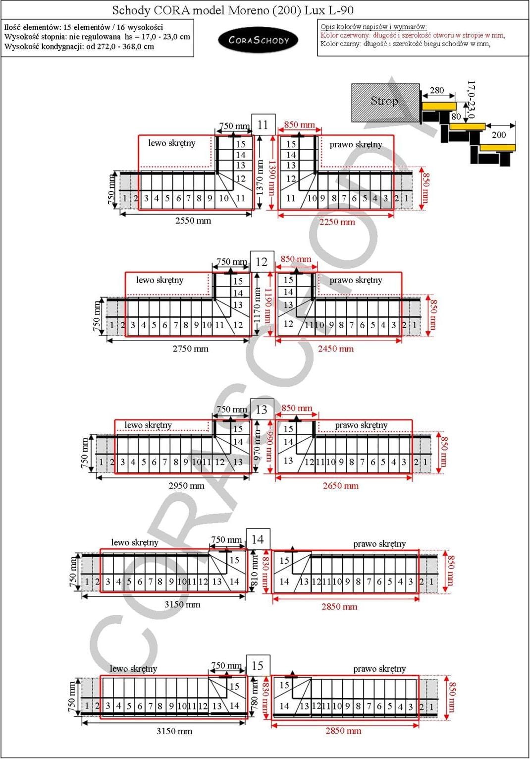 Floor to floor 280 - 368 cm - 15 degrees / 16 heights (standard)