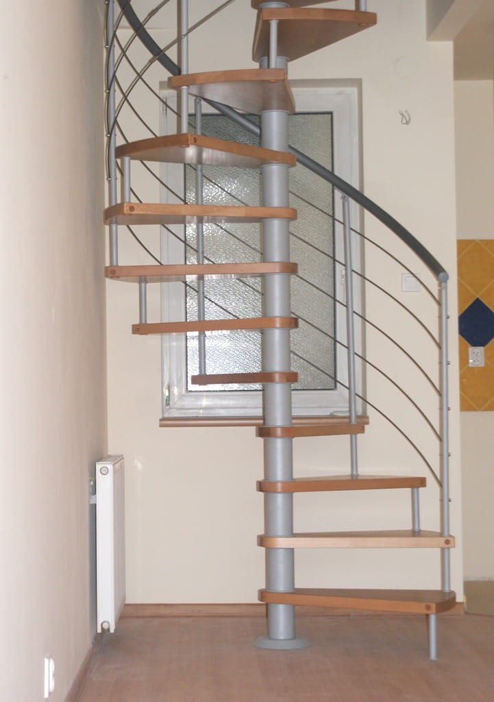 Zestaw schodów spiralnych przystosowanych do średnicy otworu w stropie o wartości 190 cm. Elementy wykonano z litego drewna (kolor do wyboru z palety barw producenta) oraz stali malowanej proszkowo w kolorze srebrny mat struktura. Można montować je samodzielnie, lecz producent udostępnia również usługę montażową za dopłatą.