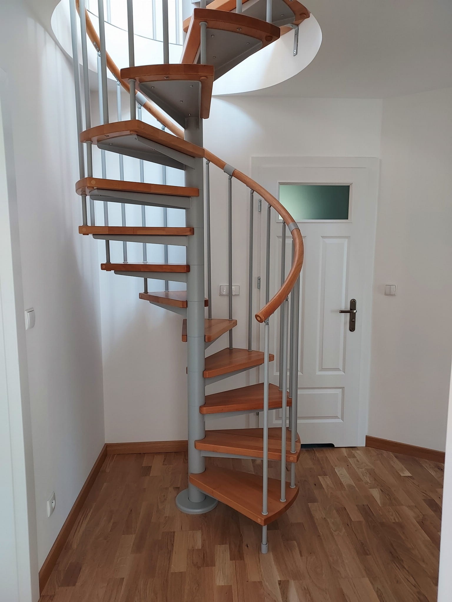 Zestaw schodów spiralnych przystosowanych do średnicy otworu w stropie o wartości 150 cm. Elementy wykonano z litego drewna (kolor do wyboru z palety barw producenta) oraz stali malowanej proszkowo w kolorze srebrny mat struktura. Można montować je samodzielnie, lecz producent udostępnia również usługę montażową za dopłatą.