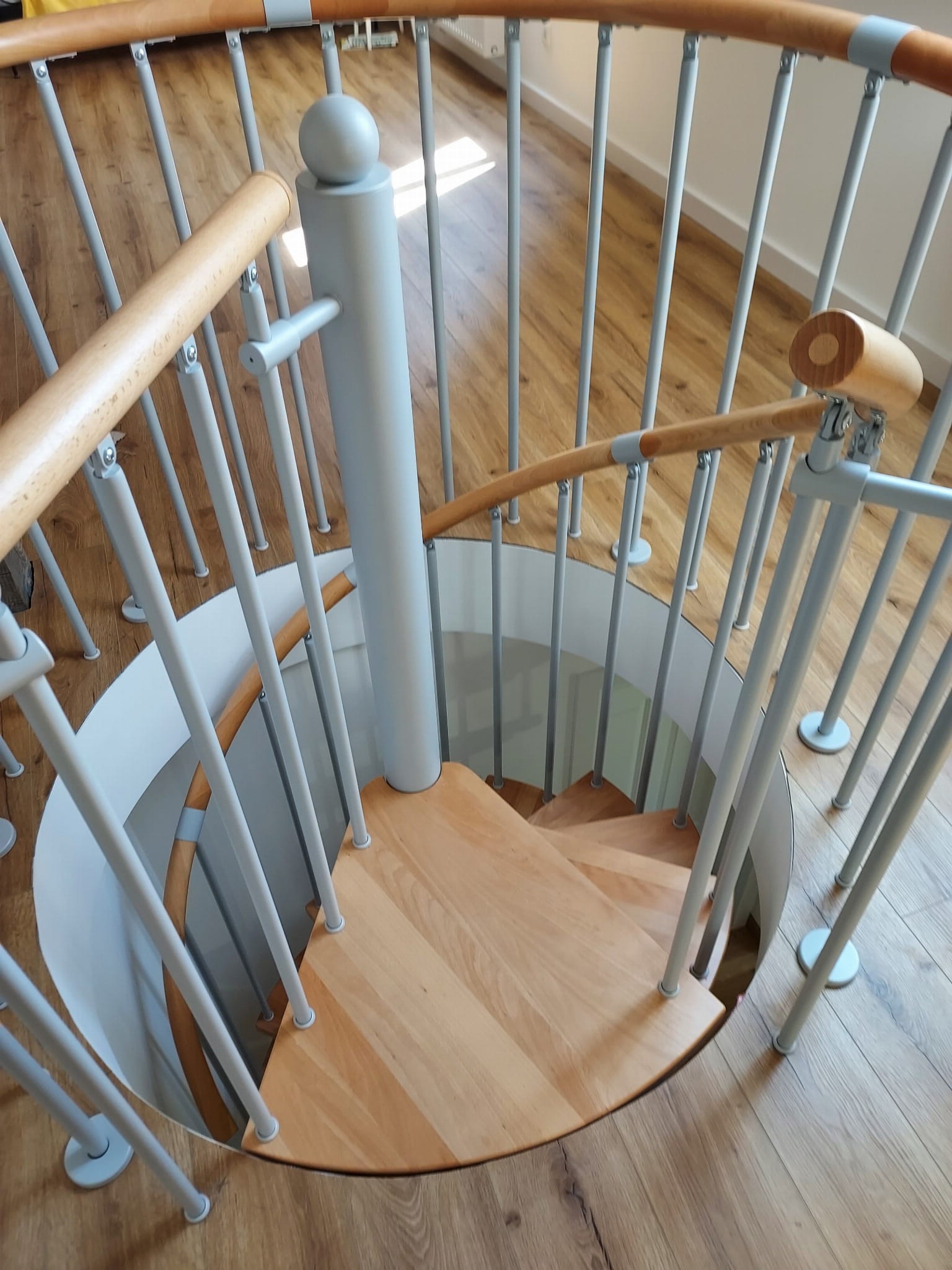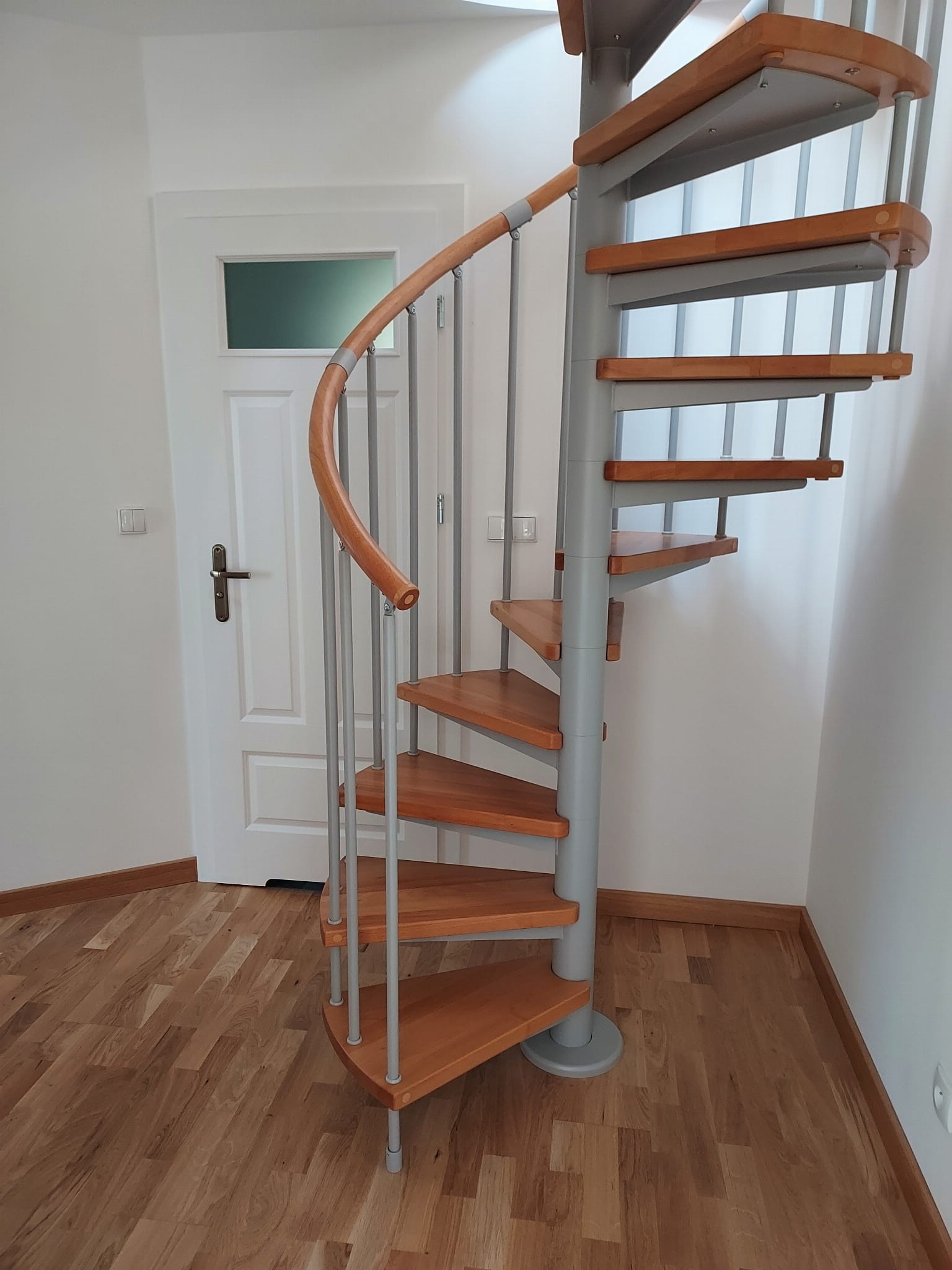 Zestaw schodów spiralnych przystosowanych do średnicy otworu w stropie o wartości 200 cm. Elementy wykonano z litego drewna (kolor do wyboru z palety barw producenta) oraz stali malowanej proszkowo w kolorze srebrny mat struktura. Można montować je samodzielnie, lecz producent udostępnia również usługę montażową za dopłatą.