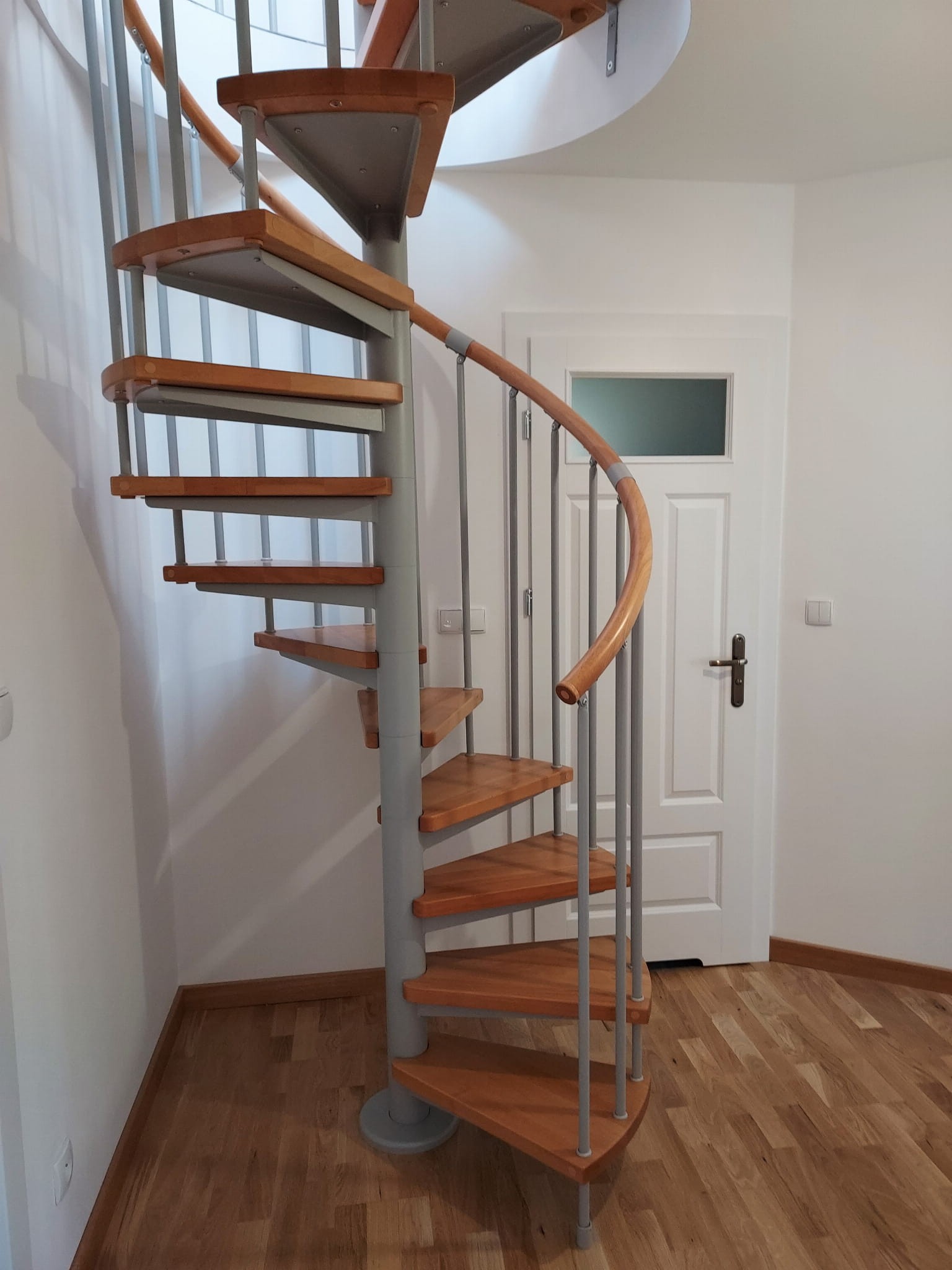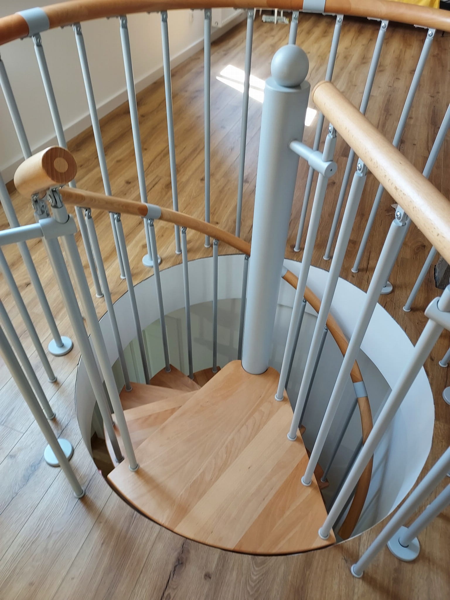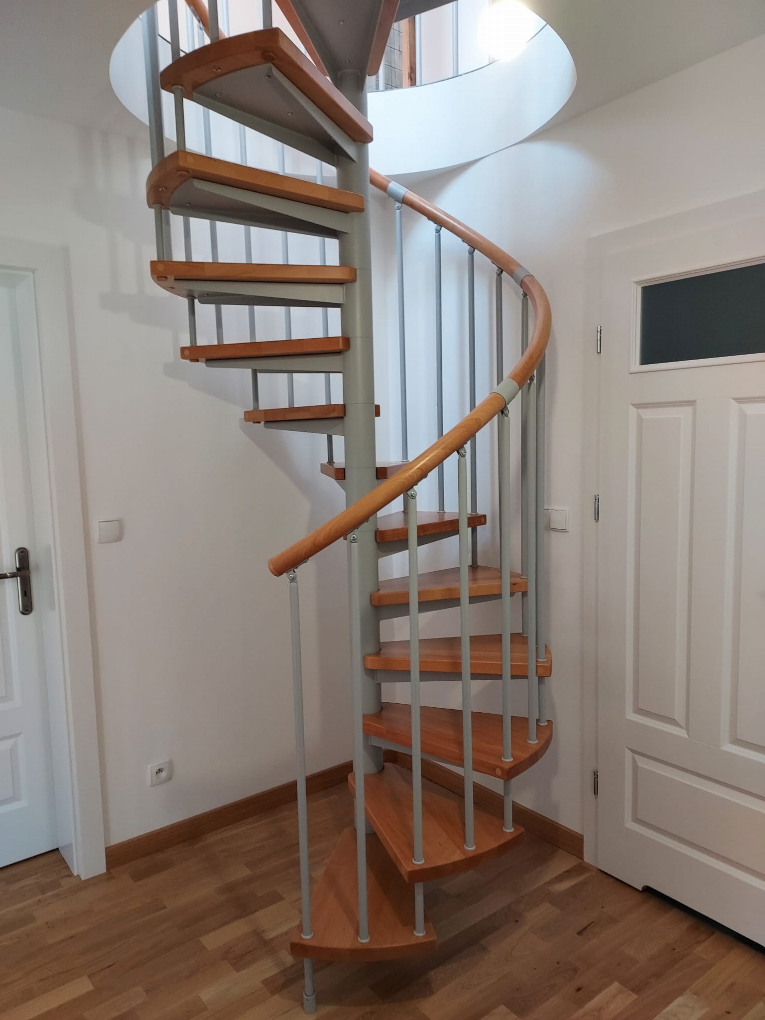 Zestaw schodów spiralnych przystosowanych do średnicy otworu w stropie o wartości 210 cm. Elementy wykonano z litego drewna (kolor do wyboru z palety barw producenta) oraz stali malowanej proszkowo w kolorze srebrny mat struktura. Można montować je samodzielnie, lecz producent udostępnia również usługę montażową za dopłatą.