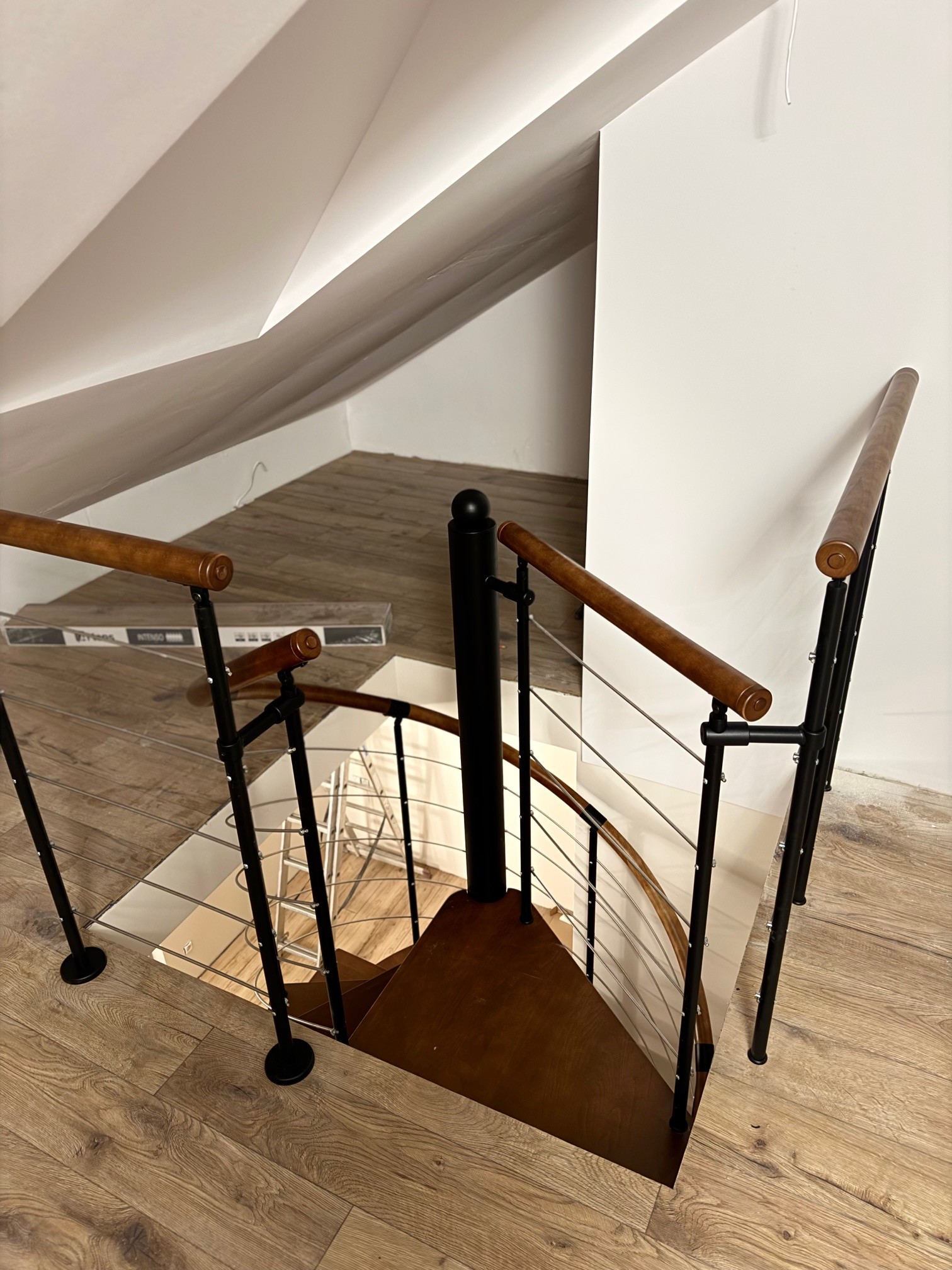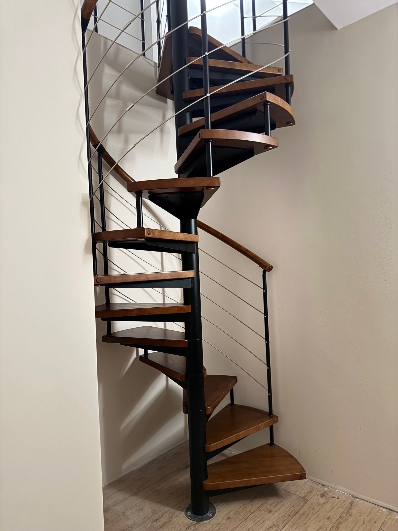 Zestaw schodów spiralnych przystosowanych do średnicy otworu w stropie o wartości 130 cm. Elementy wykonano z litego drewna (kolor do wyboru z palety barw producenta) oraz stali malowanej proszkowo w kolorze czarny mat struktura. Można montować je samodzielnie, lecz producent udostępnia również usługę montażową za dopłatą.