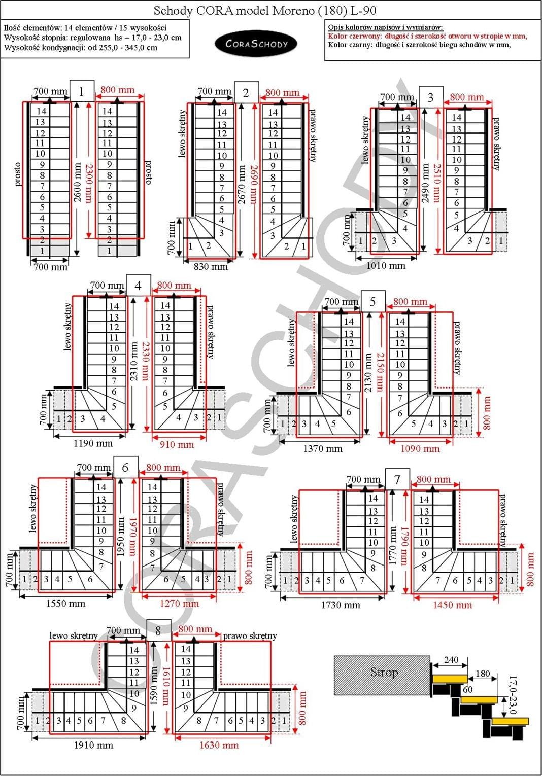 Schody Moreno 180 06 posiada możliwość zamontowania w jednej z 26 układów, które prezentuje producent. Zabieg schodów jest w oryginalnej formie skrętny L-90, w lewo bądź w prawo, jak również nietypowego zabiegu prostego - w tym przypadku należy dodać odpowiednią adnotację do formularza.