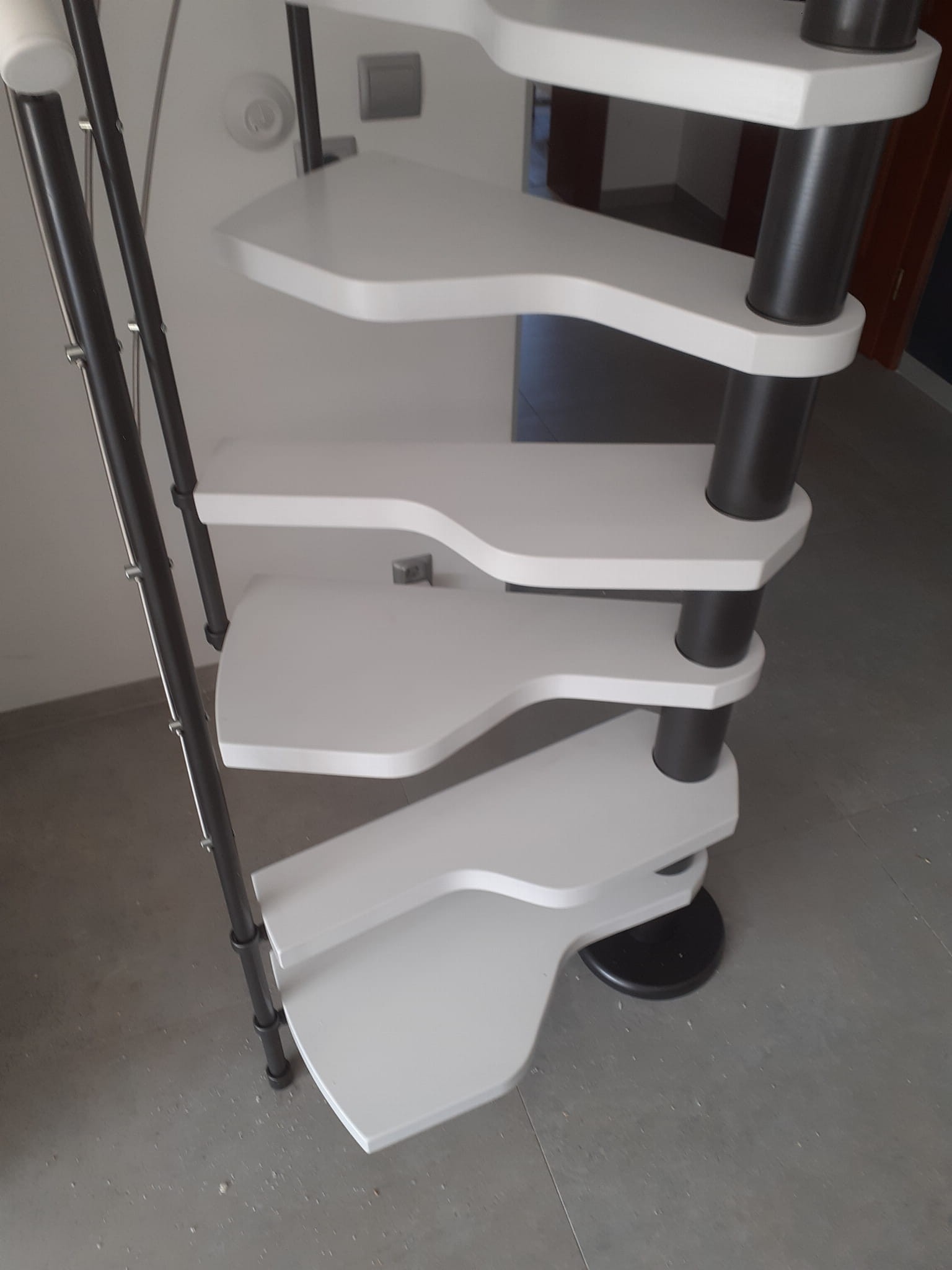 Schody kręcone, spiralne złożone z 12 elementów stanowiących 13 poziomów. Elementy wykonano z litego drewna (kolor do wyboru z palety barw producenta) oraz stali malowanej proszkowo w kolorze antracyt grafit. Można montować je samodzielnie, lecz producent udostępnia również usługę montażową za dopłatą.