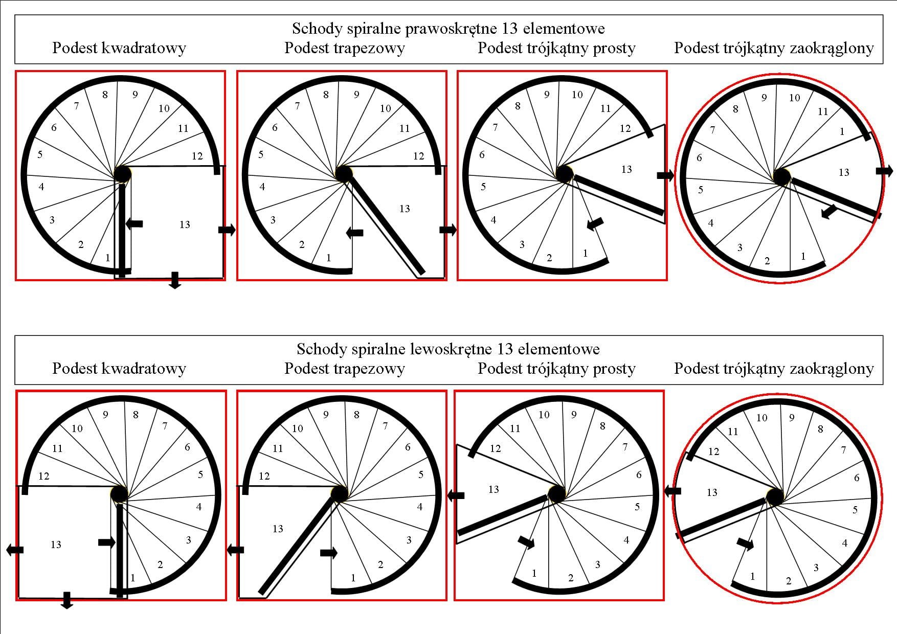 - Zabieg schodów: lewoskrętny lub prawoskrętny patrząc od pierwszego stopnia