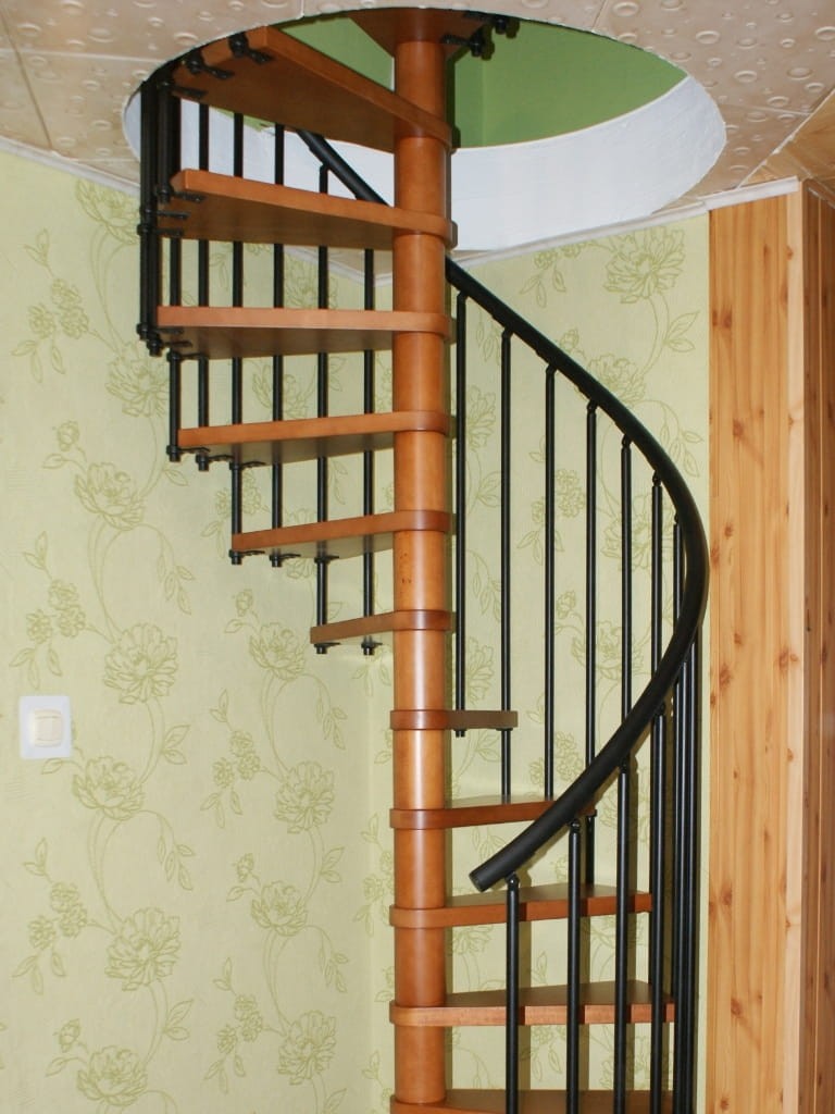 Zestaw schodów spiralnych przystosowanych do średnicy otworu w stropie o wartości 130 cm. Elementy wykonano z litego drewna (kolor do wyboru z palety barw producenta) oraz stali malowanej proszkowo w kolorze czarny mat struktura. Można montować je samodzielnie, lecz producent udostępnia również usługę montażową za dopłatą.
