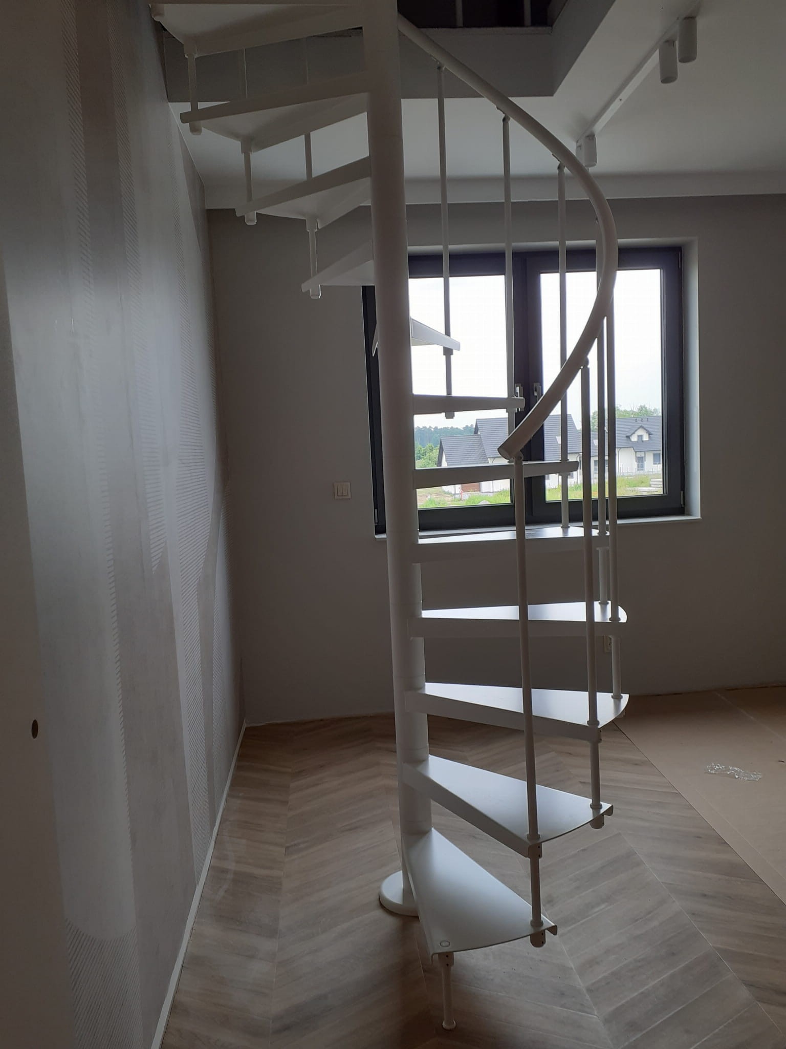 Zostava točitých schodov prispôsobená priemeru otvoru v strope 190 cm. Prvky sú vyrobené z kockovaného plechu a ocele s práškovým nástrekom v bielej farbe (RAL 9003). Môžete si ich zostaviť sami, ale výrobca poskytuje za príplatok aj službu montáže.