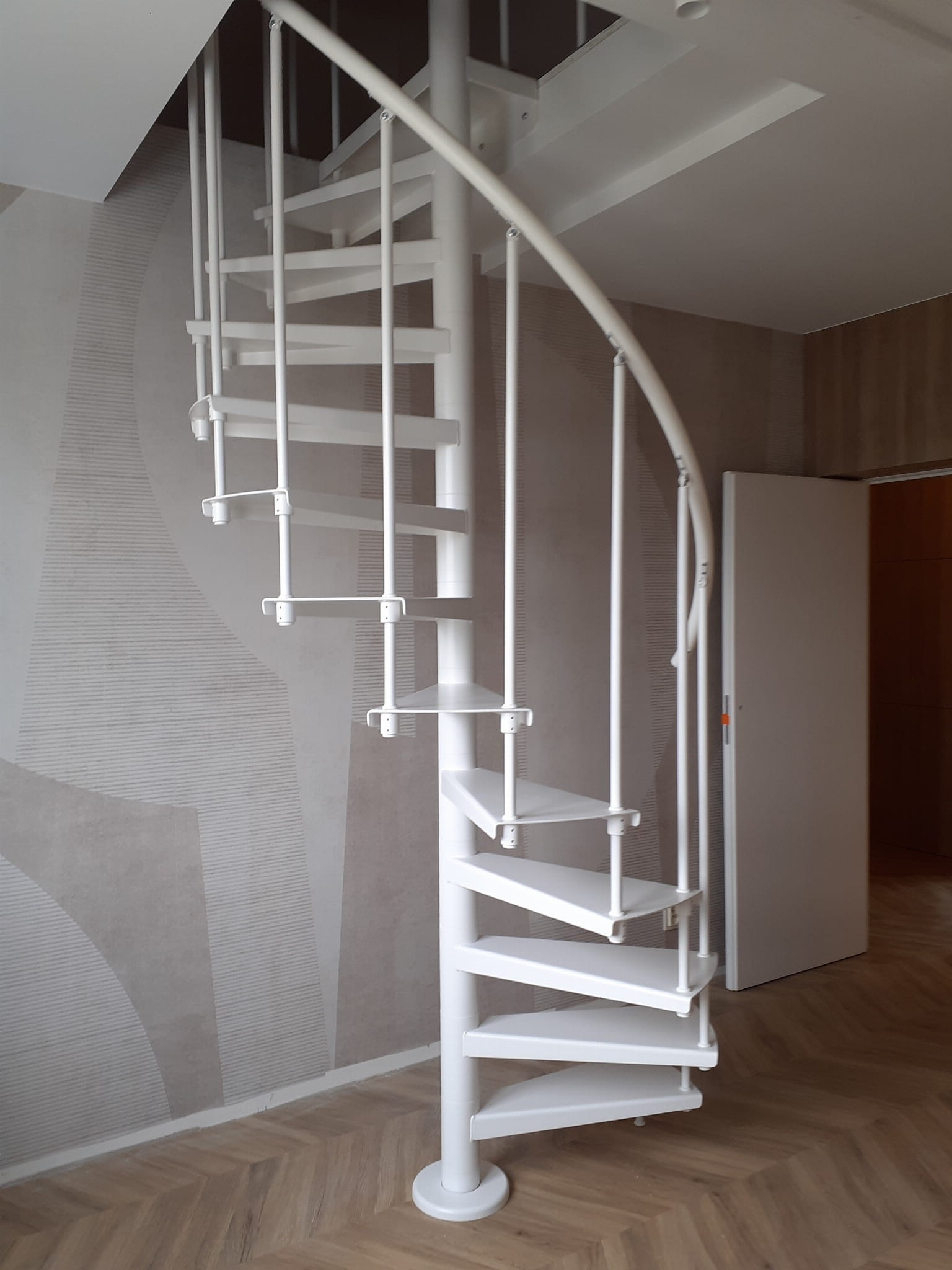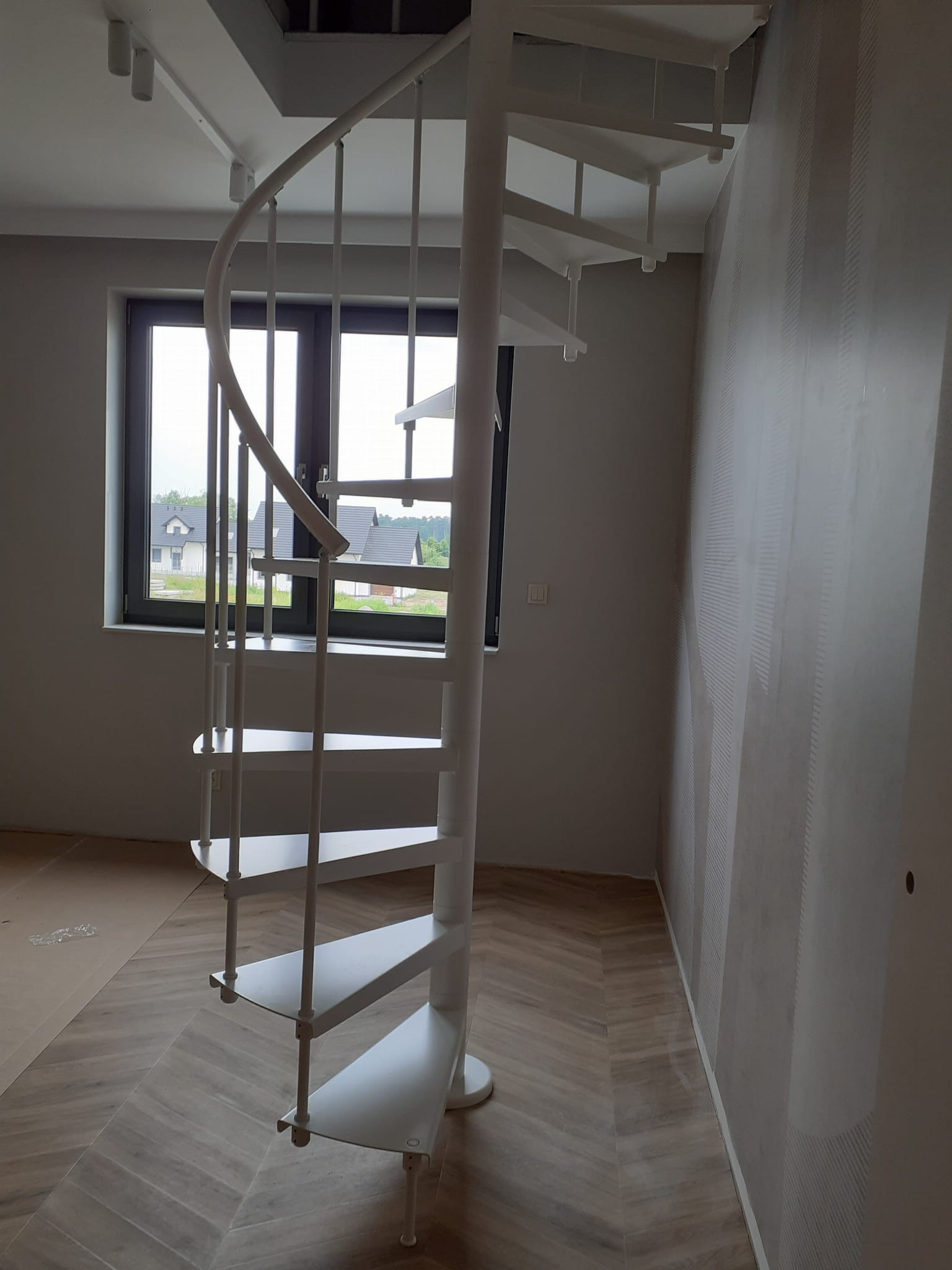 Zostava točitých schodov prispôsobená priemeru otvoru v strope 200 cm. Prvky sú vyrobené z kockovaného plechu a ocele s práškovým nástrekom v bielej farbe (RAL 9003). Môžete si ich zostaviť sami, ale výrobca poskytuje za príplatok aj službu montáže.