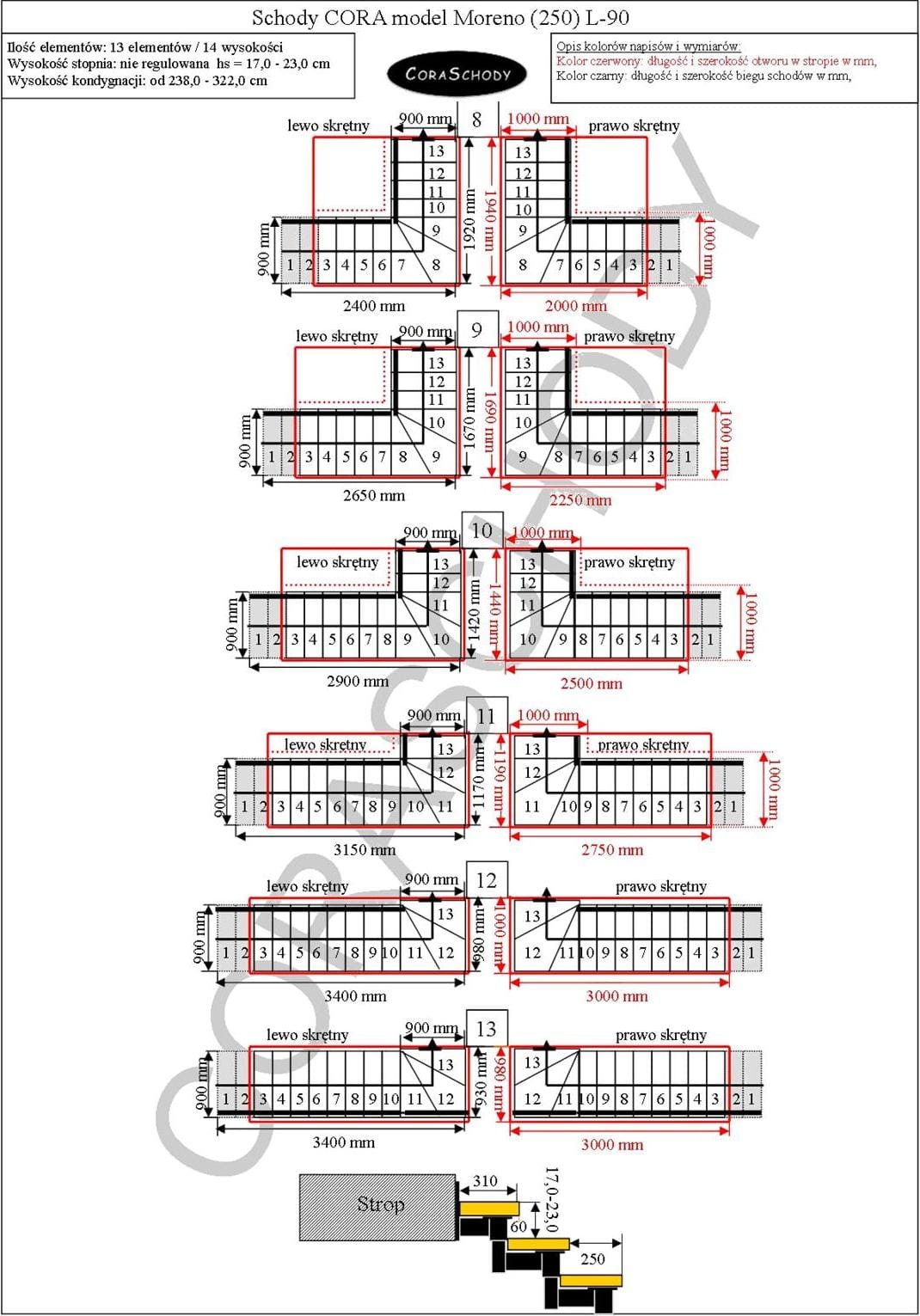 Schody Moreno 250 06 je možné inštalovať do jedného z 26 systémov prezentovaných výrobcom. Opracovanie schodiska je v originálnej torznej forme L-90, vľavo alebo vpravo, ako aj nezvyčajný rovný postup - v tomto prípade je potrebné do formulára pridať príslušnú anotáciu.
