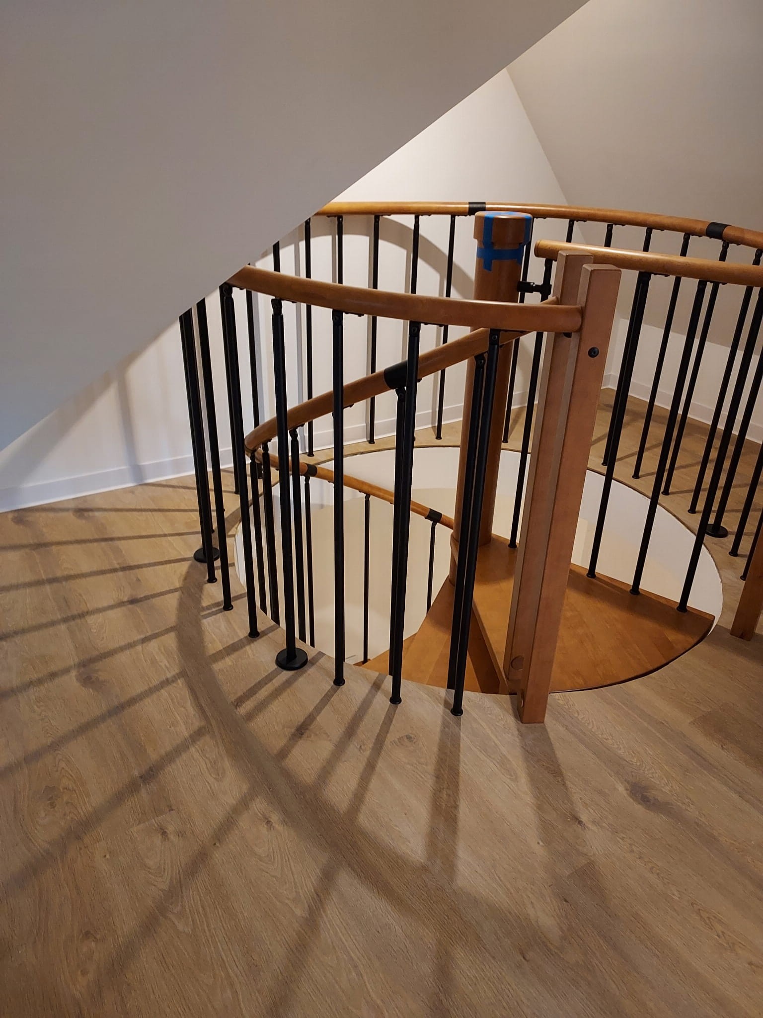 Zostava točitých schodov prispôsobená priemeru otvoru v strope 150 cm. Prvky sú vyrobené z masívneho dreva (farba na výber z farebnej palety výrobcu) a práškovo lakovanej ocele v matnej čiernej štruktúre. Môžete si ich zostaviť sami, ale výrobca poskytuje za príplatok aj službu montáže.