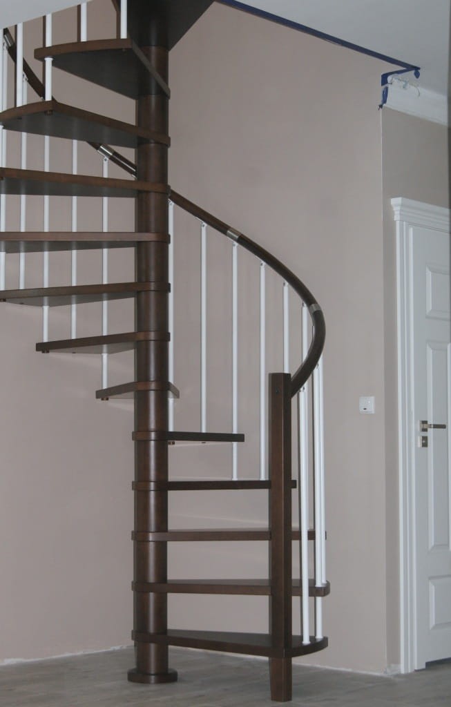 Zostava točitých schodov prispôsobená priemeru otvoru v strope 170 cm. Prvky sú vyrobené z masívneho dreva (farba na výber z farebnej palety výrobcu) a práškovo lakovanej ocele v bielej matnej štruktúre. Môžete si ich zostaviť sami, ale výrobca poskytuje za príplatok aj službu montáže.