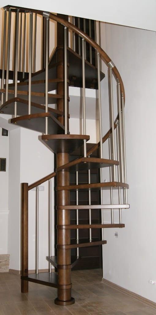 Zostava točitých schodov prispôsobená priemeru otvoru v strope 140 cm. Prvky sú vyrobené z masívneho dreva (farba na výber z farebnej palety výrobcu) a ocele s práškovým nástrekom v saténovej oceli. Môžete si ich zostaviť sami, ale výrobca poskytuje za príplatok aj službu montáže.