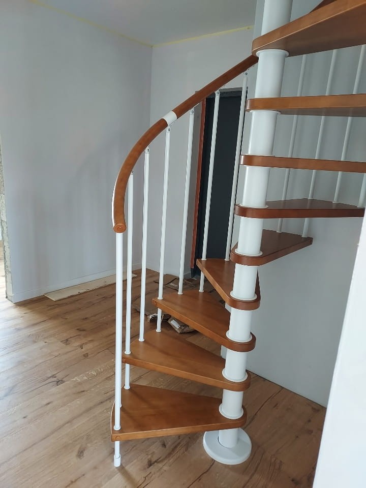 Zostava točitých schodov prispôsobená priemeru otvoru v strope 160 cm. Prvky sú vyrobené z masívneho dreva (farba na výber z farebnej palety výrobcu) a bielej ocele s práškovým nástrekom. Môžete si ich zostaviť sami, ale výrobca poskytuje za príplatok aj službu montáže.