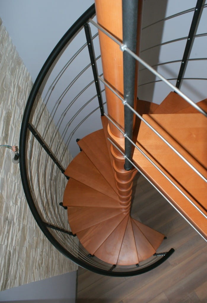 Sada točitých schodů přizpůsobená průměru otvoru ve stropě 180 cm. Prvky jsou vyrobeny z masivního dřeva (barva na výběr z barevné palety výrobce) a práškově lakované oceli v černé matné struktuře. Můžete si je sestavit sami, ale výrobce poskytuje za příplatek i službu montáže.