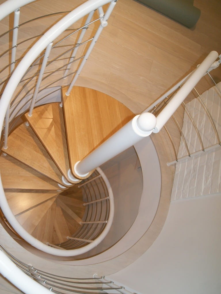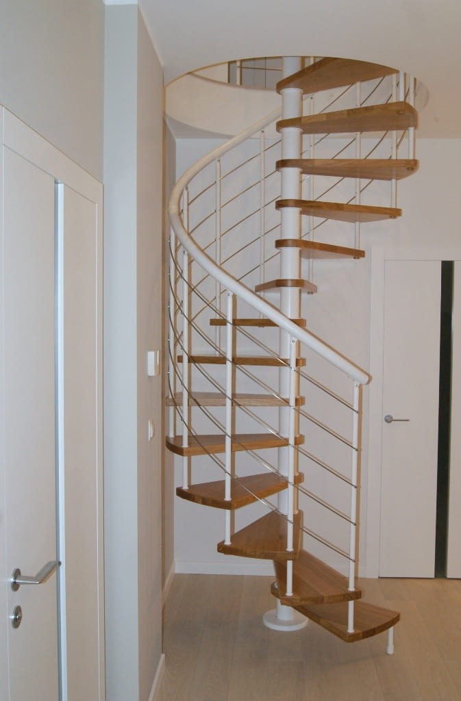 Zostava točitých schodov prispôsobená priemeru otvoru v strope 140 cm. Prvky sú vyrobené z masívneho dreva (farba na výber z farebnej palety výrobcu) a práškovo lakovanej ocele v bielej matnej farbe. Môžete si ich zostaviť sami, ale výrobca poskytuje za príplatok aj službu montáže.