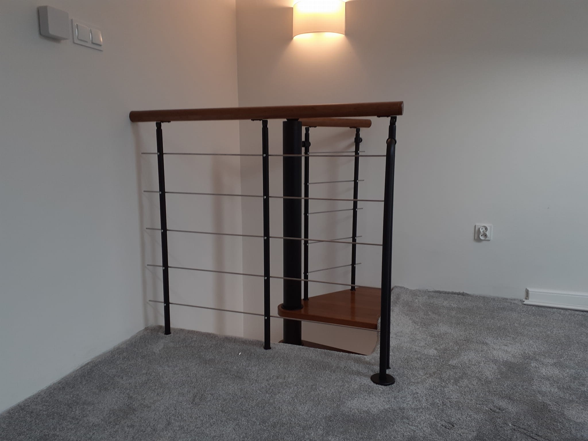 Zostava točitých schodov prispôsobená priemeru otvoru v strope 140 cm. Prvky sú vyrobené z masívneho dreva (farba na výber z farebnej palety výrobcu) a práškovo lakovanej ocele v čiernej matnej štruktúre. Môžete si ich zostaviť sami, ale výrobca poskytuje za príplatok aj službu montáže.