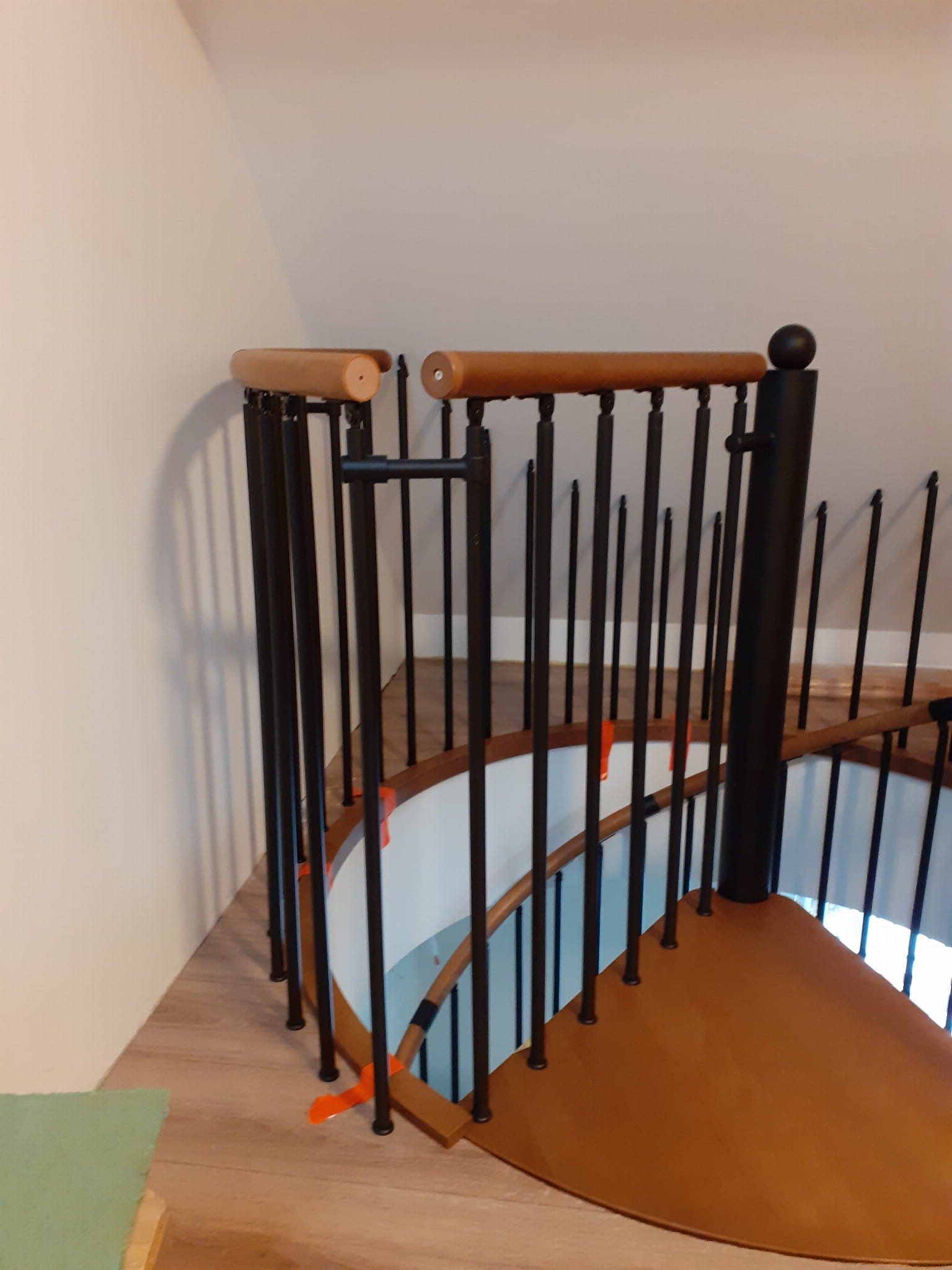Zostava točitých schodov prispôsobená priemeru otvoru v strope 160 cm. Prvky sú vyrobené z masívneho dreva (farba na výber z farebnej palety výrobcu) a práškovo lakovanej ocele v čiernej matnej štruktúre. Môžete si ich zostaviť sami, ale výrobca poskytuje za príplatok aj službu montáže.