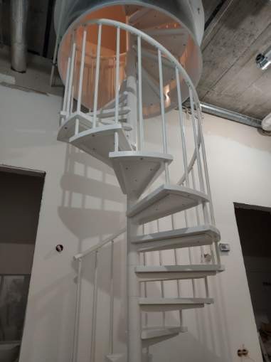 Zostava točitých schodov prispôsobená priemeru otvoru v strope 180 cm. Prvky sú vyrobené z masívneho dreva (farba na výber z farebnej palety výrobcu) a práškovo lakovanej ocele v matnej čiernej štruktúre. Môžete si ich zostaviť sami, ale výrobca poskytuje za príplatok aj službu montáže.