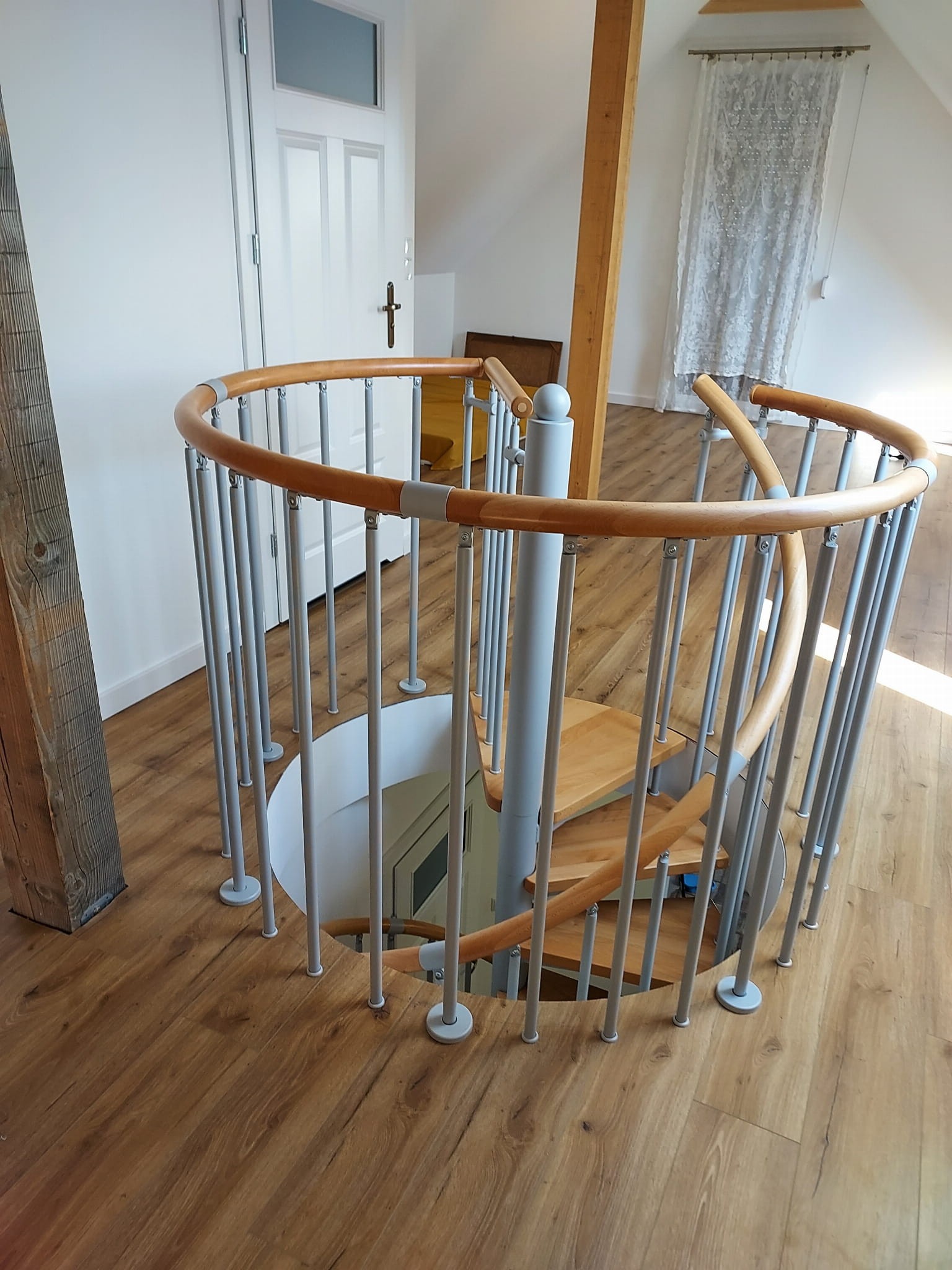 Ponúkané točité schody sa hodia do dvoch typov otvorov v strope a v závislosti od nich majú rôzne podesty. Trojuholníkové podesty zapadajú do okrúhlych otvorov. Trojuholníkové a lichobežníkové plošiny sú prispôsobené štvorcovým otvorom. Schody v tomto modeli majú pravú a ľavú úpravu. Môžu byť namontované univerzálne, v závislosti od koncepcie.