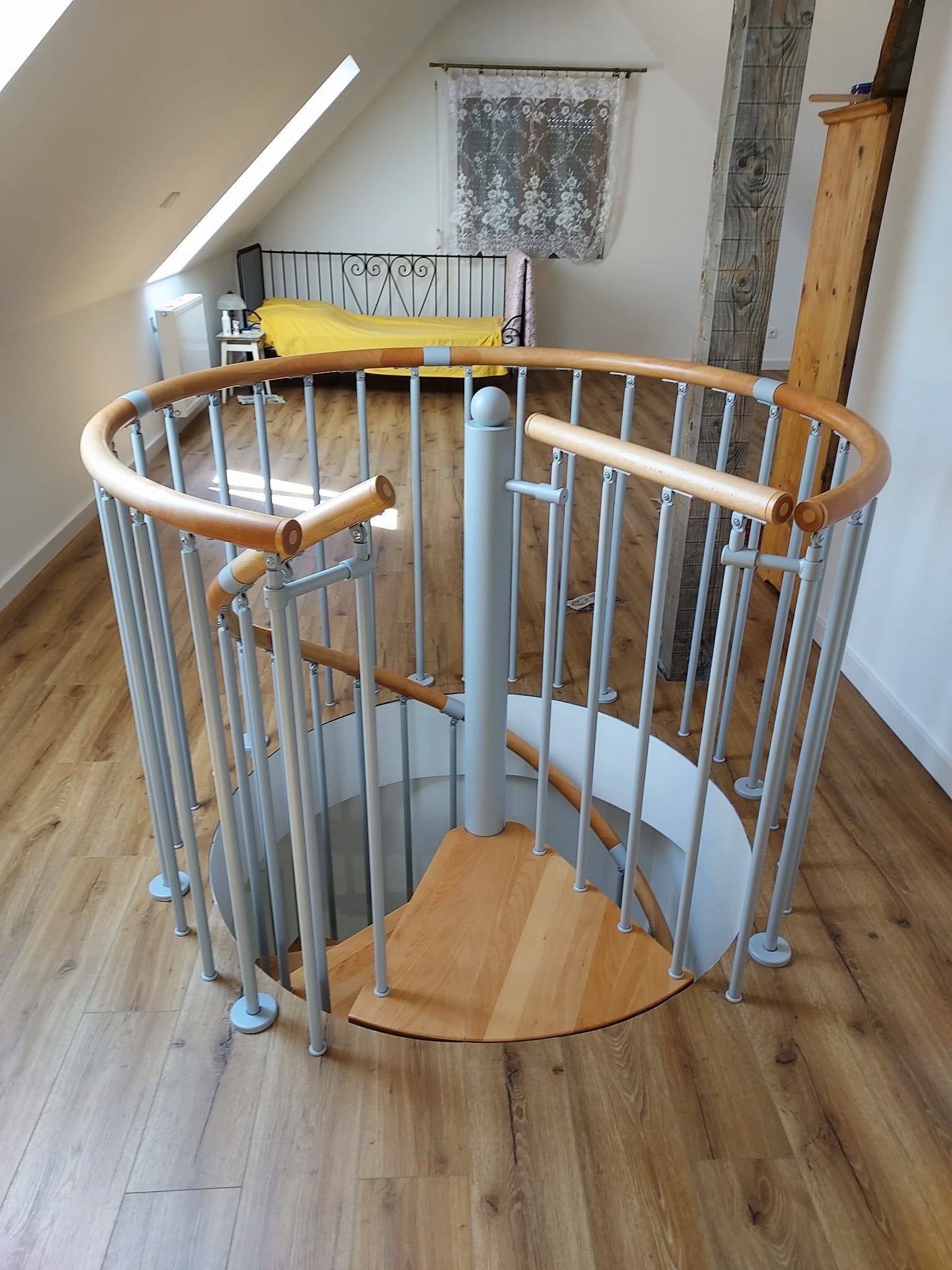 Zostava točitých schodov prispôsobená priemeru otvoru v strope 170 cm. Prvky sú vyrobené z masívneho dreva (farba na výber z farebnej palety výrobcu) a práškovo lakovanej ocele v strieborná matná štruktúre. Môžete si ich zostaviť sami, ale výrobca poskytuje za príplatok aj službu montáže.