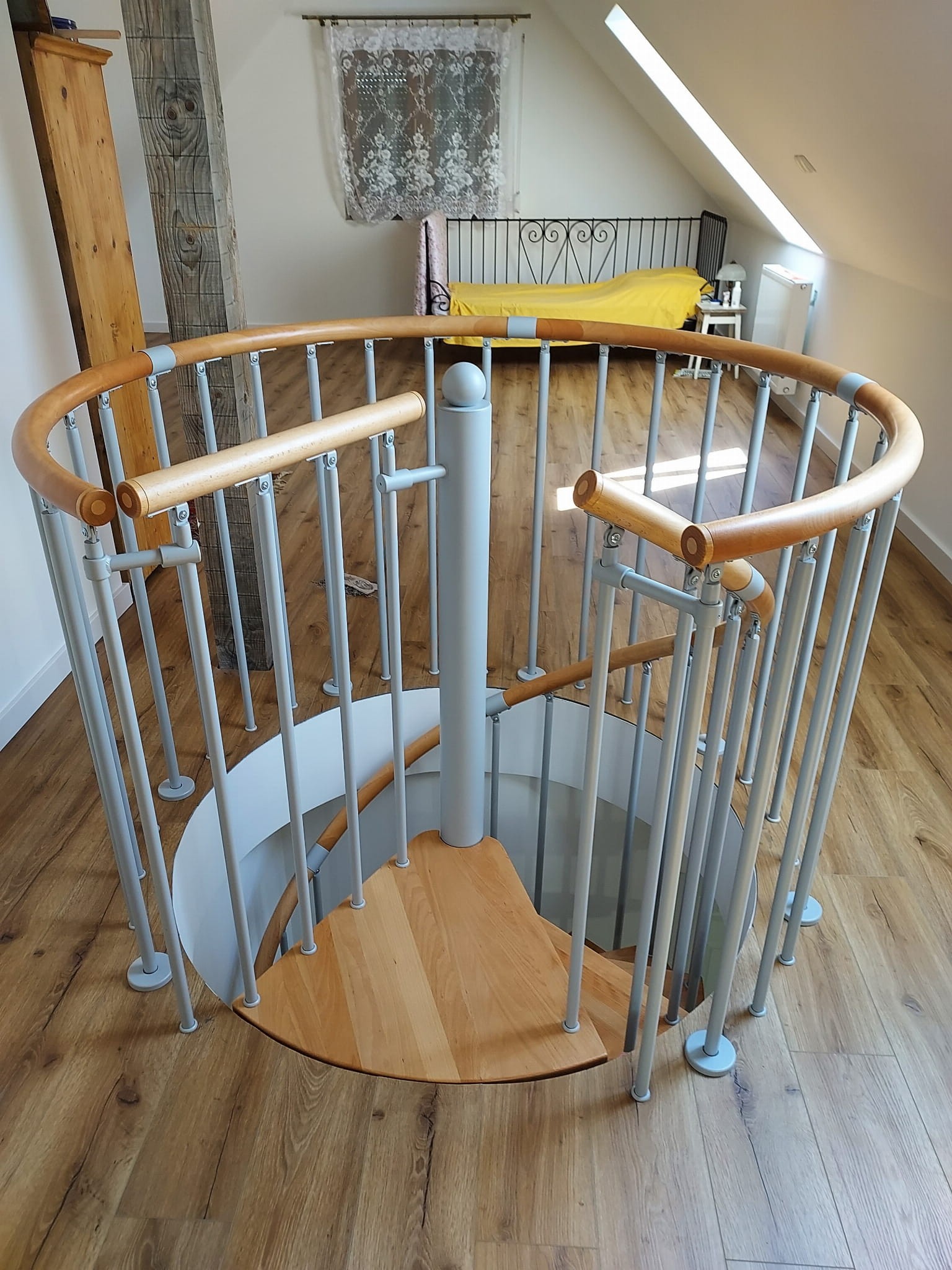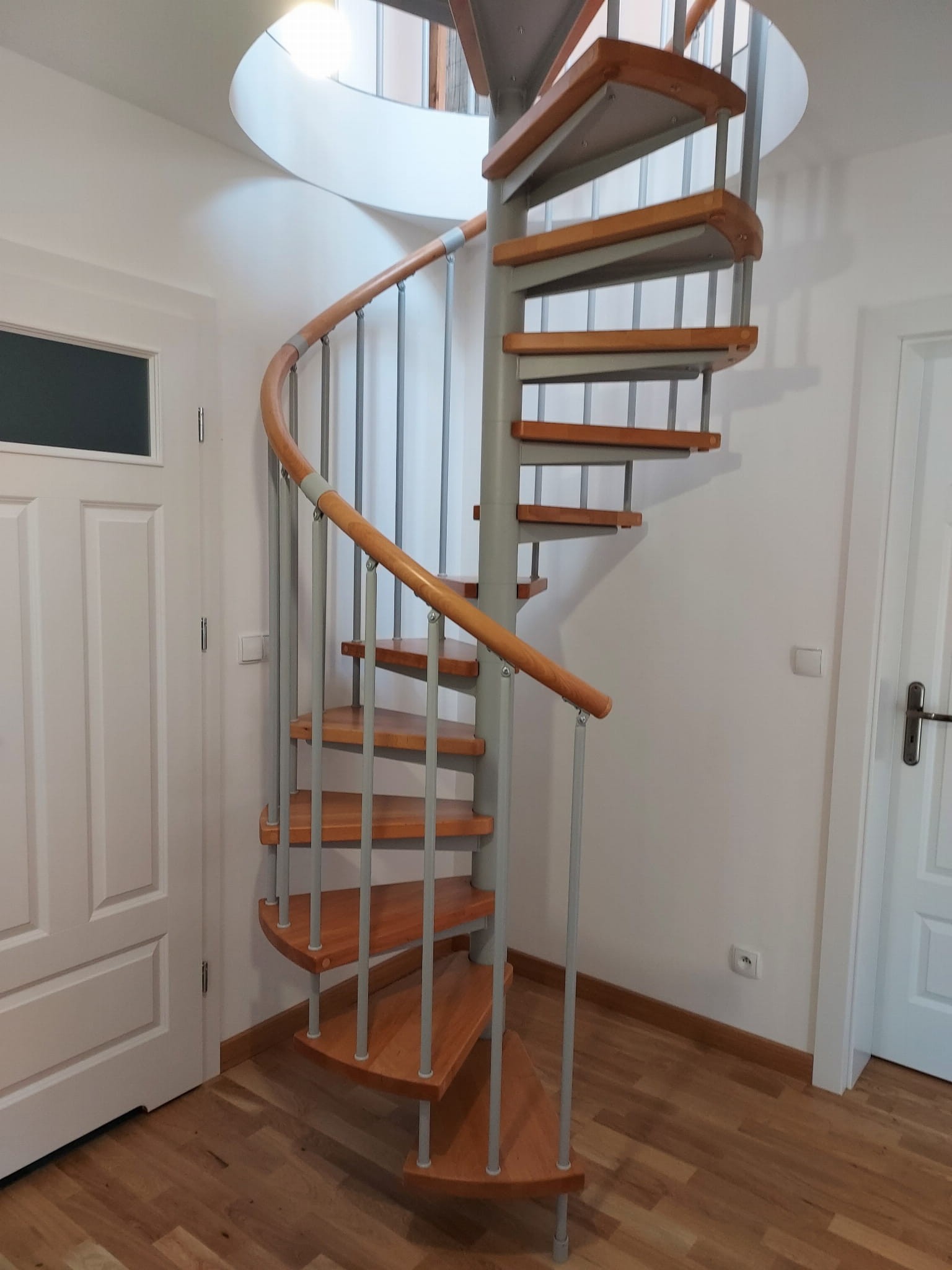 Zostava točitých schodov prispôsobená priemeru otvoru v strope 200 cm. Prvky sú vyrobené z masívneho dreva (farba na výber z farebnej palety výrobcu) a práškovo lakovanej ocele v strieborná matná štruktúre. Môžete si ich zostaviť sami, ale výrobca poskytuje za príplatok aj službu montáže.