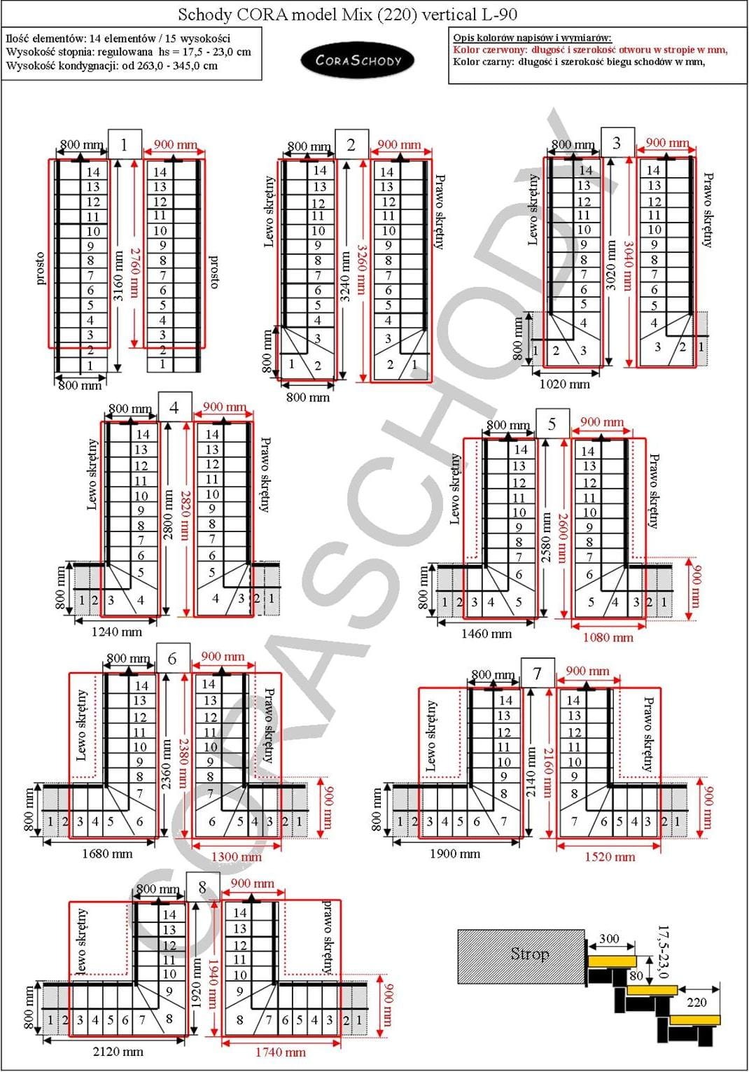 Schody Mix 220 je možné inštalovať do jedného z 28 systémov prezentovaných výrobcom. Opracovanie schodiska je v originálnej torznej forme L-90, vľavo alebo vpravo, ako aj nezvyčajný rovný postup - v tomto prípade je potrebné do formulára pridať príslušnú anotáciu.