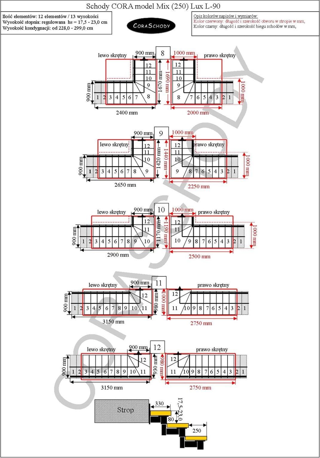 Schody Mix 250 je možné inštalovať do jedného z 24 systémov prezentovaných výrobcom. Opracovanie schodiska je v originálnej torznej forme L-90, vľavo alebo vpravo, ako aj nezvyčajný rovný postup - v tomto prípade je potrebné do formulára pridať príslušnú anotáciu.