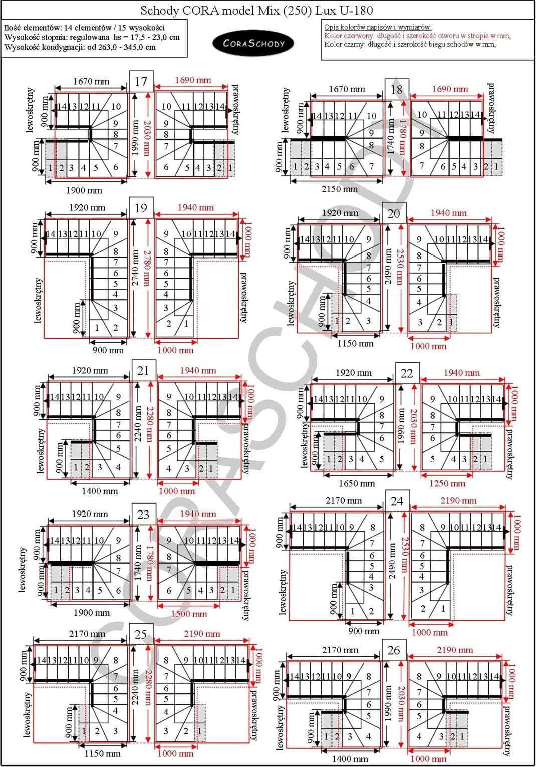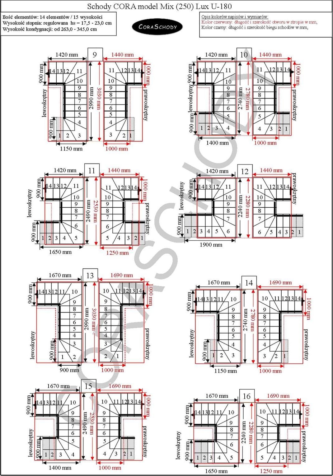 Schody Mix 250 lux je možné inštalovať v jednej zo 66 konfigurácií, ktoré sú plne prezentované výrobcom. Tento model má originálnu úpravu U-180, pravú aj ľavú. Jednoduchý postup je možné objednať po pridaní anotácií do objednávkového formulára.