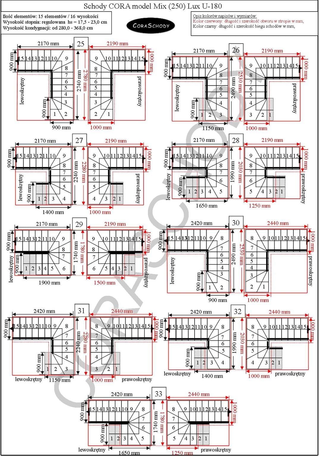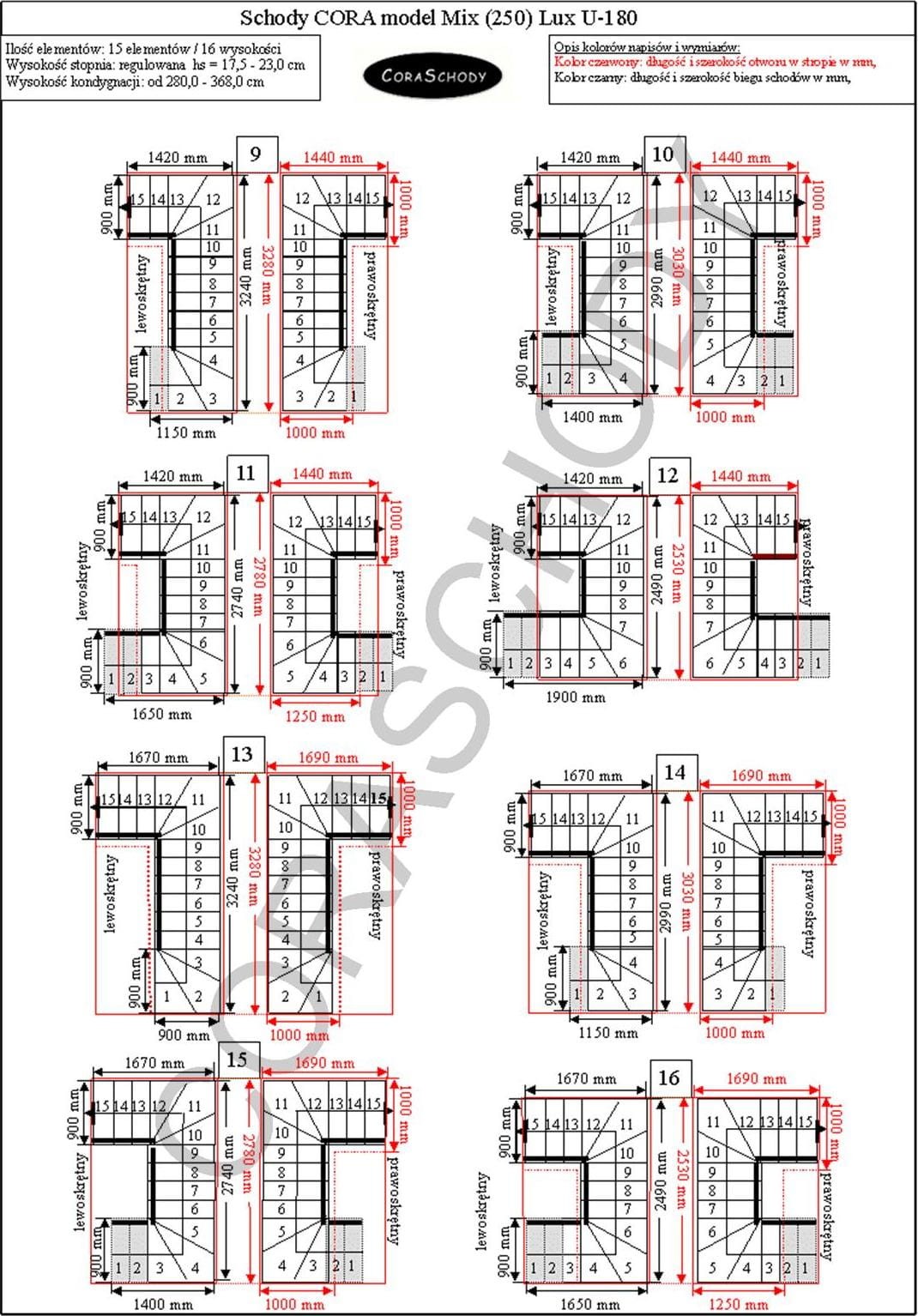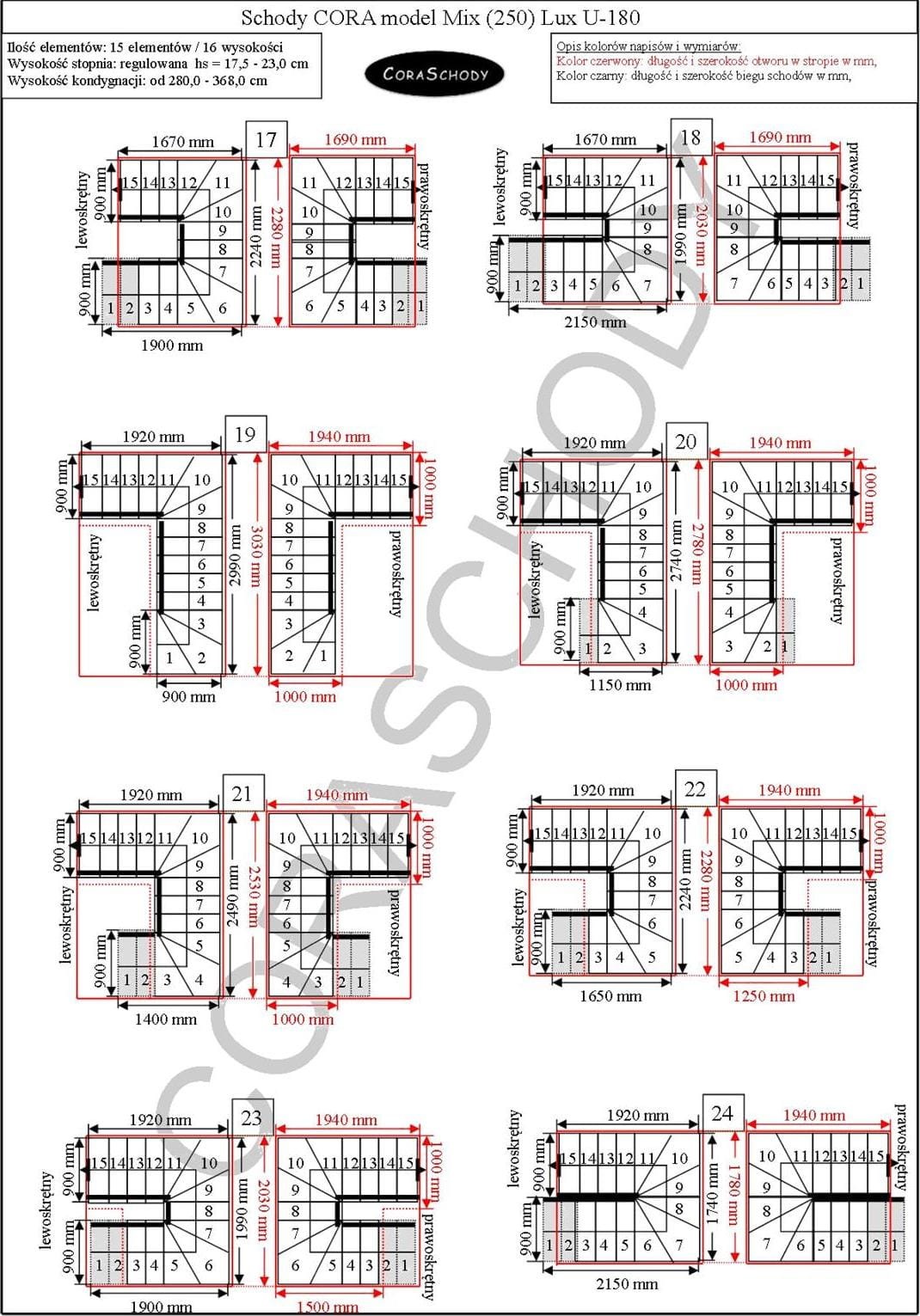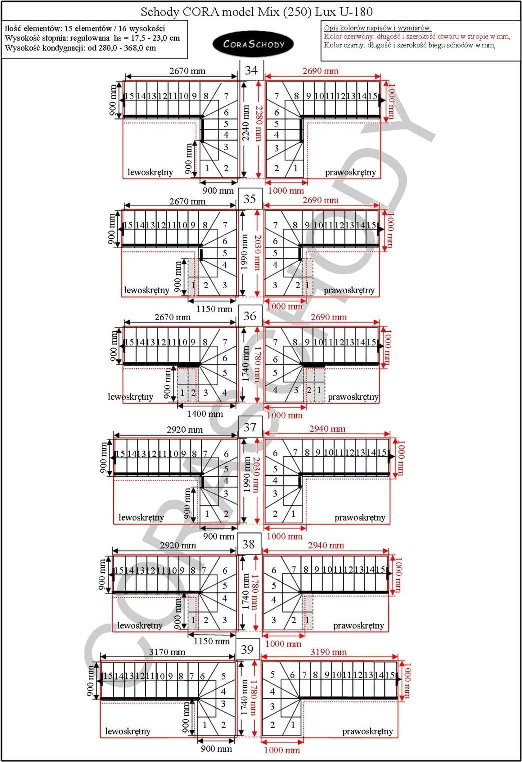 Schody Mix 250 lux je možné inštalovať v jednej zo 78 konfigurácií, ktoré sú plne prezentované výrobcom. Tento model má originálnu úpravu U-180, pravú aj ľavú. Jednoduchý postup je možné objednať po pridaní anotácií do objednávkového formulára.