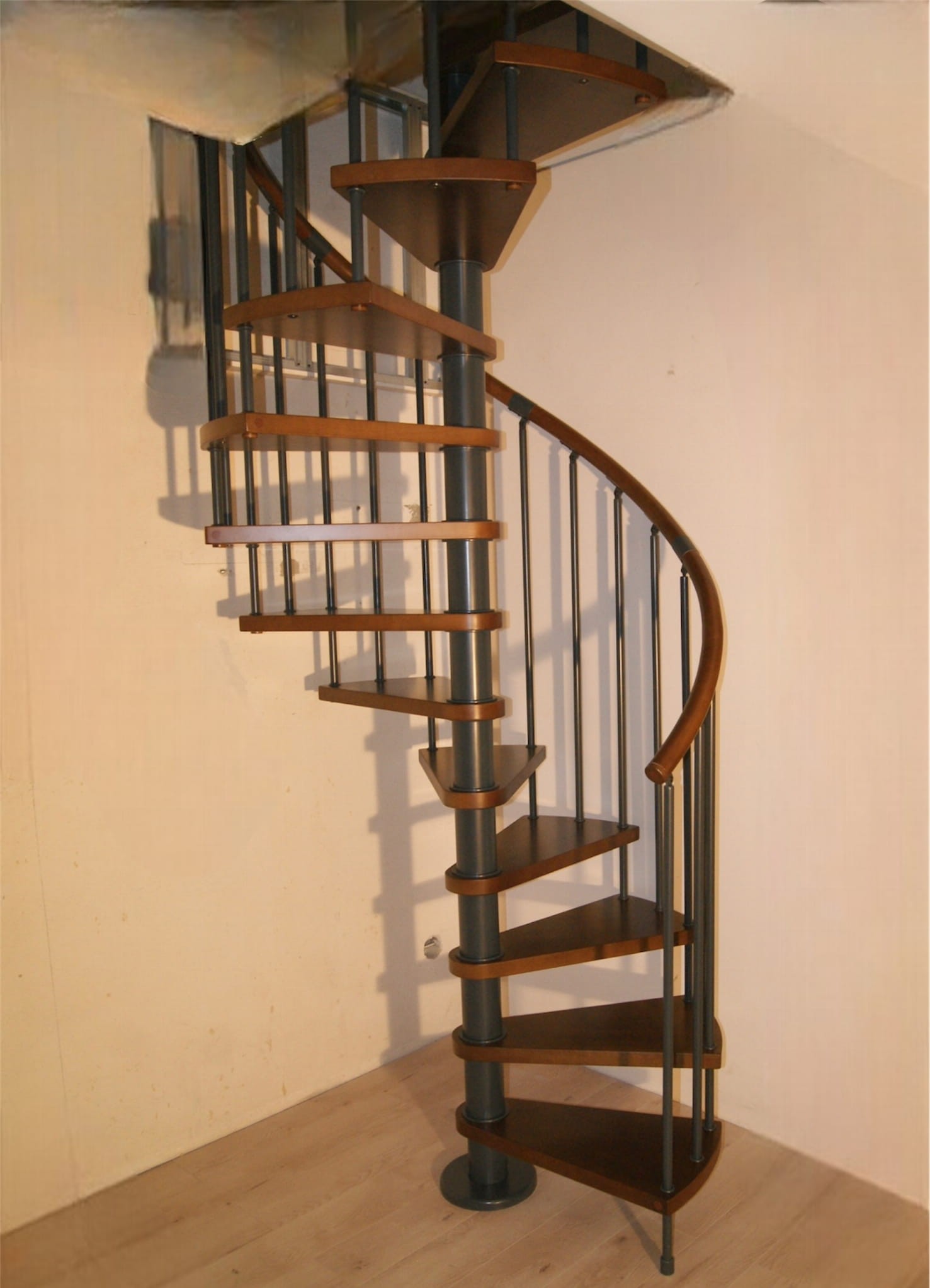 Sada točitých schodů přizpůsobená průměru otvoru ve stropě 150 cm. Prvky jsou vyrobeny z masivního dřeva (barva na výběr z barevné palety výrobce) a oceli s práškovým nástřikem v antracitové barvě (grafit). Můžete si je sestavit sami, ale výrobce poskytuje za příplatek i službu montáže.