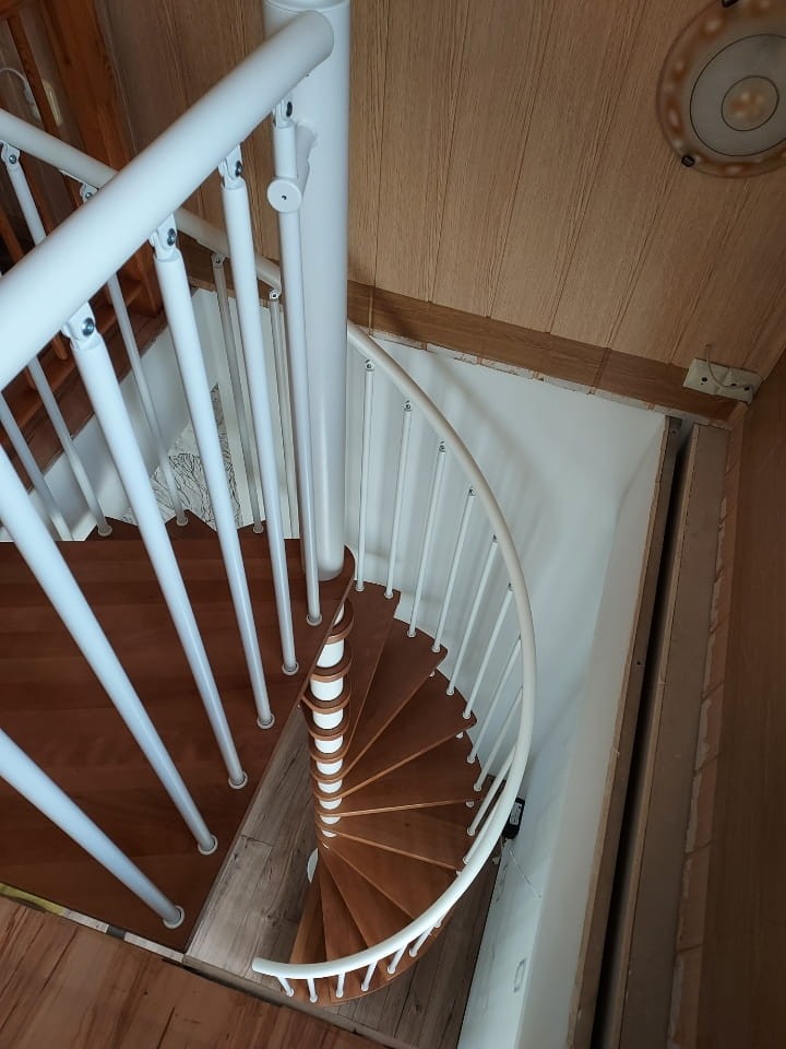Sada točitých schodů přizpůsobená průměru otvoru ve stropě 130 cm. Prvky jsou vyrobeny z masivního dřeva (barva na výběr z barevné palety výrobce) a práškově lakované oceli v matně bílé struktuře. Můžete si je sestavit sami, ale výrobce poskytuje za příplatek i službu montáže.